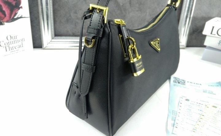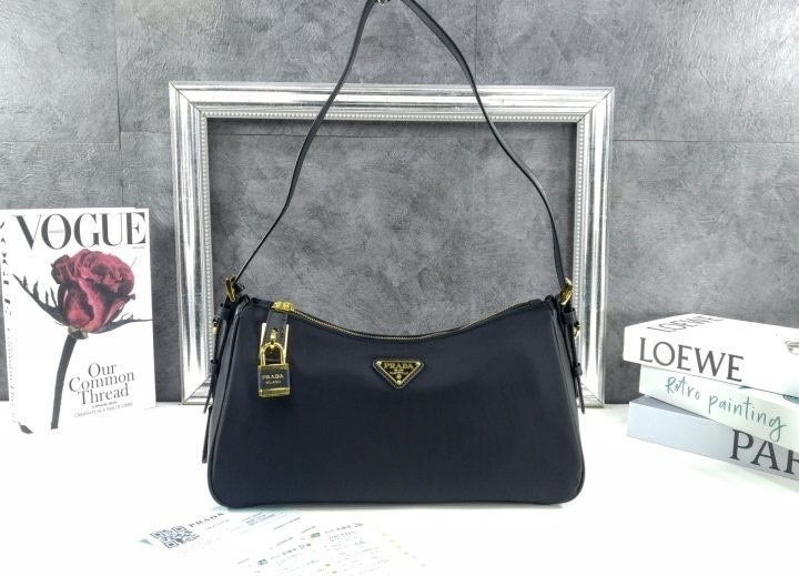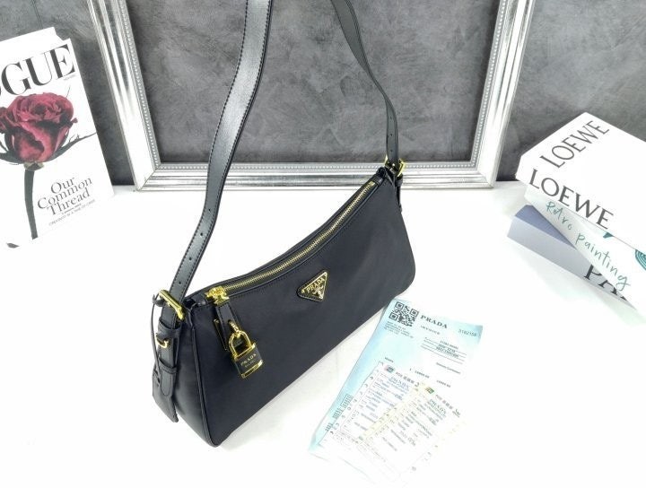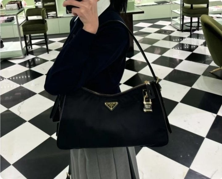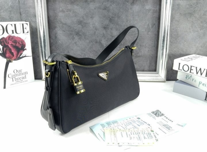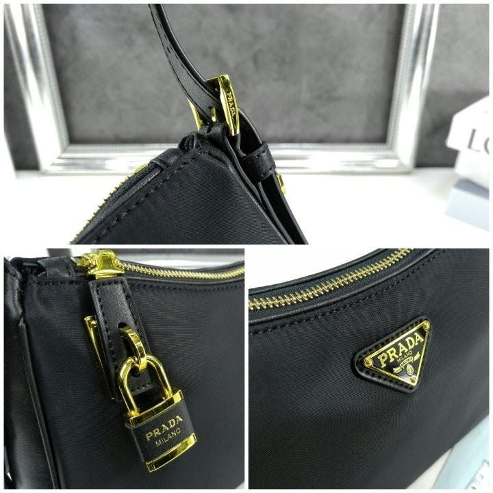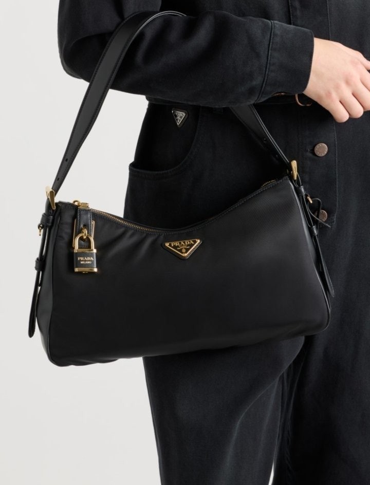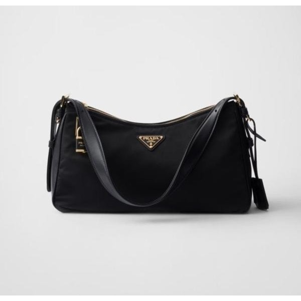 세련된 가죽 디테일이 돋보이는 리나일론 소재의 숄더백으로 모던하고 활용도 높은 디자인이 특징입니다. 지퍼 및 자물쇠 클로저가 있는 넉넉한 사이즈의 백이며 메탈 트라이앵글 로고로 장식되어 있습니다.