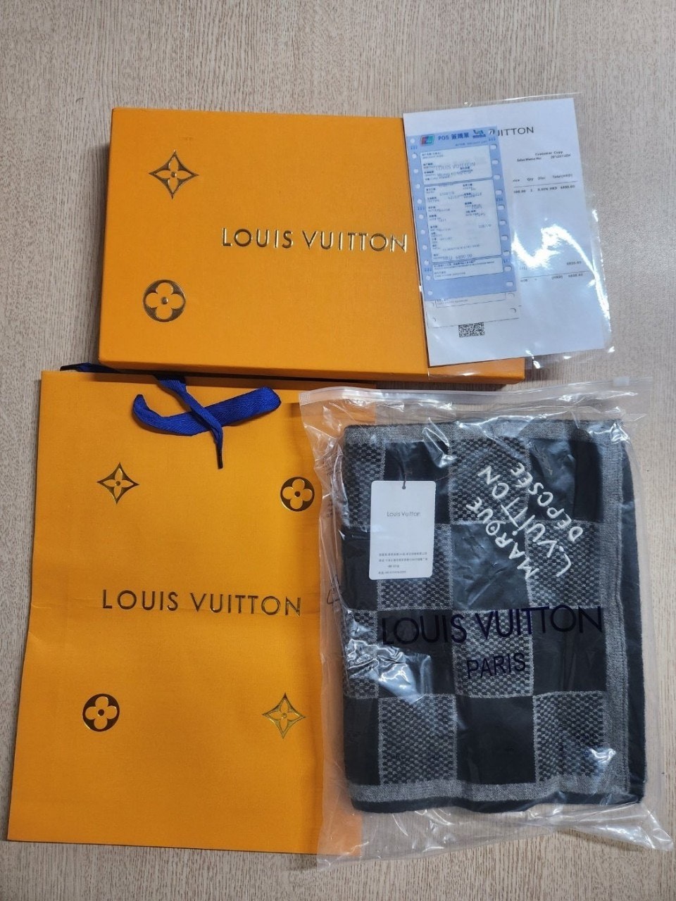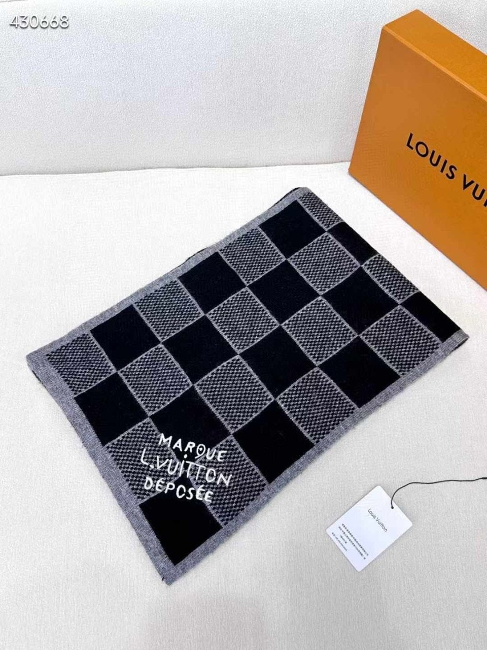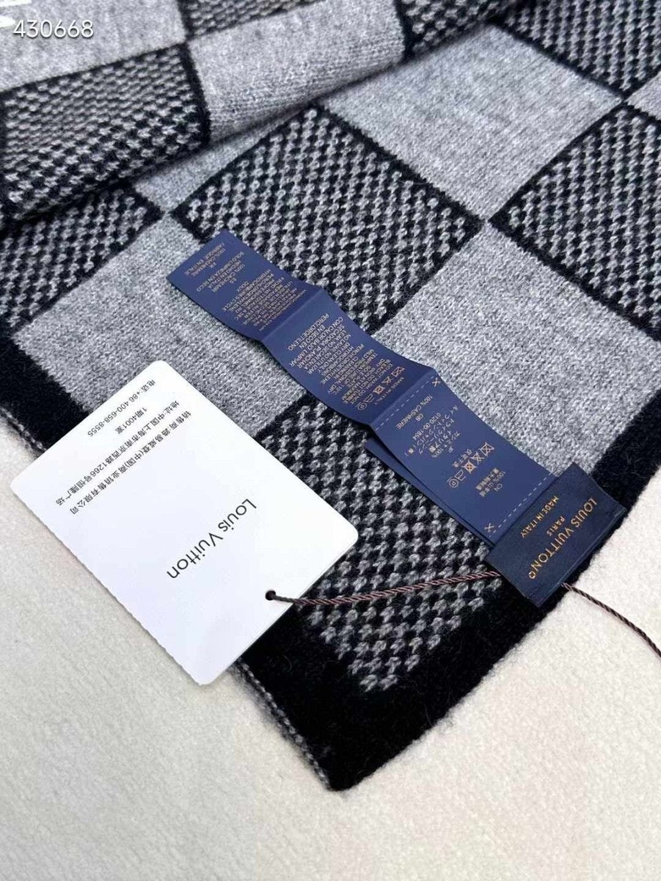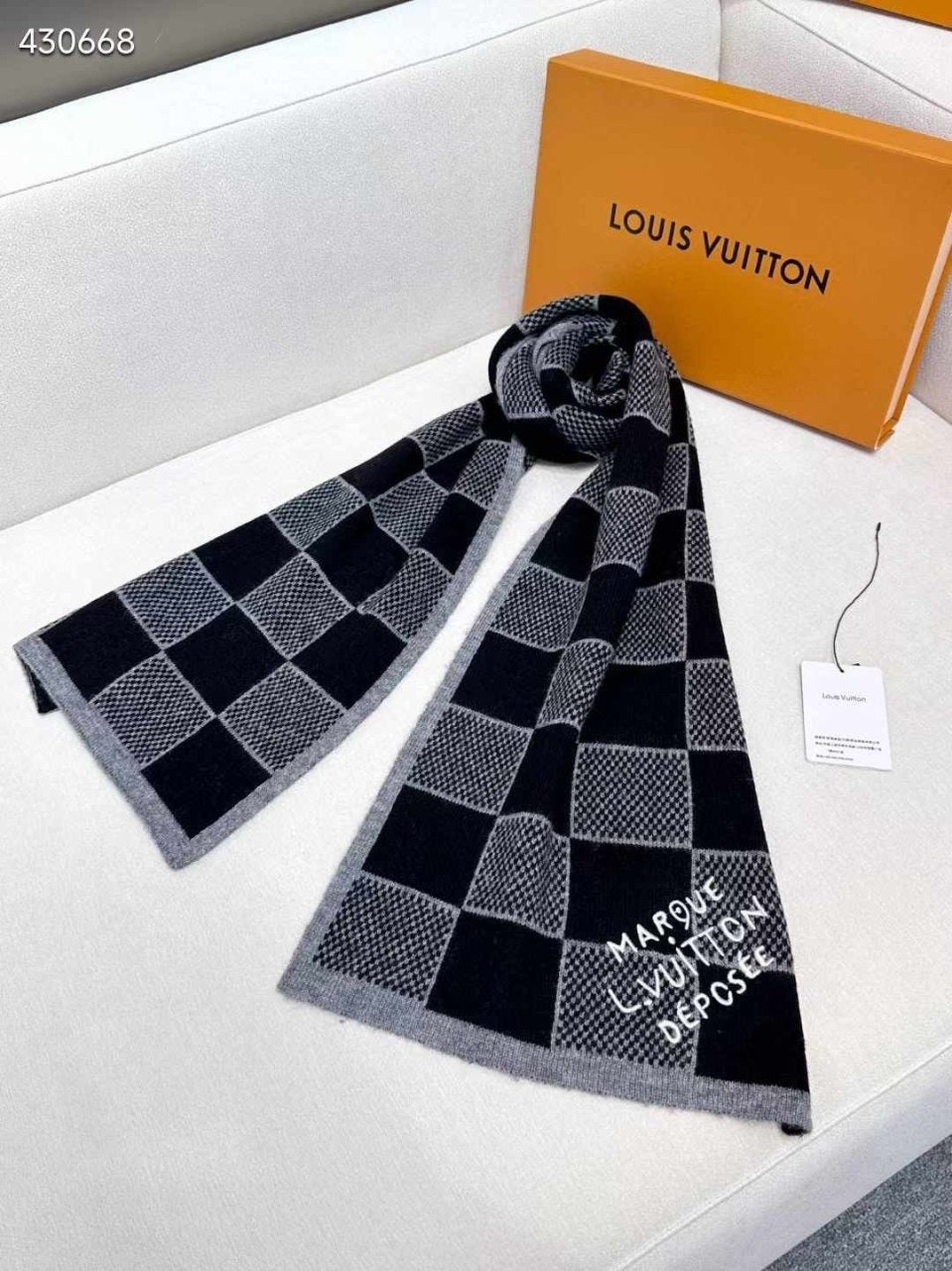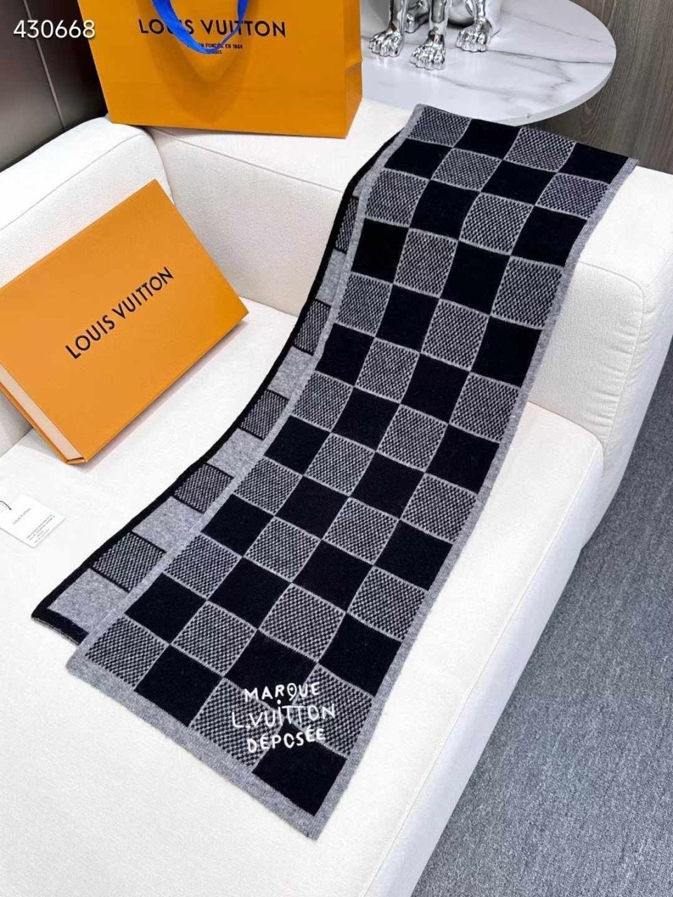 포근하면서도 고급스러운 매력이 돋보이는 울 소재의 다미에 헤리티지(Damier Heritage) 스카프