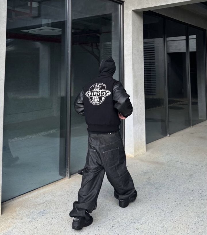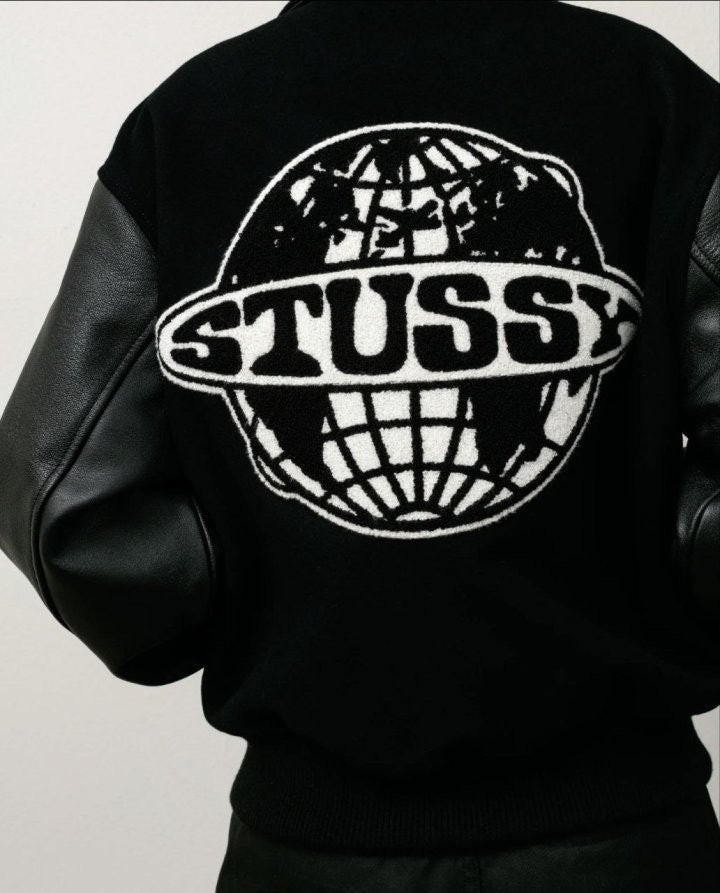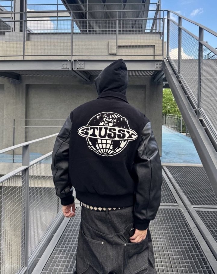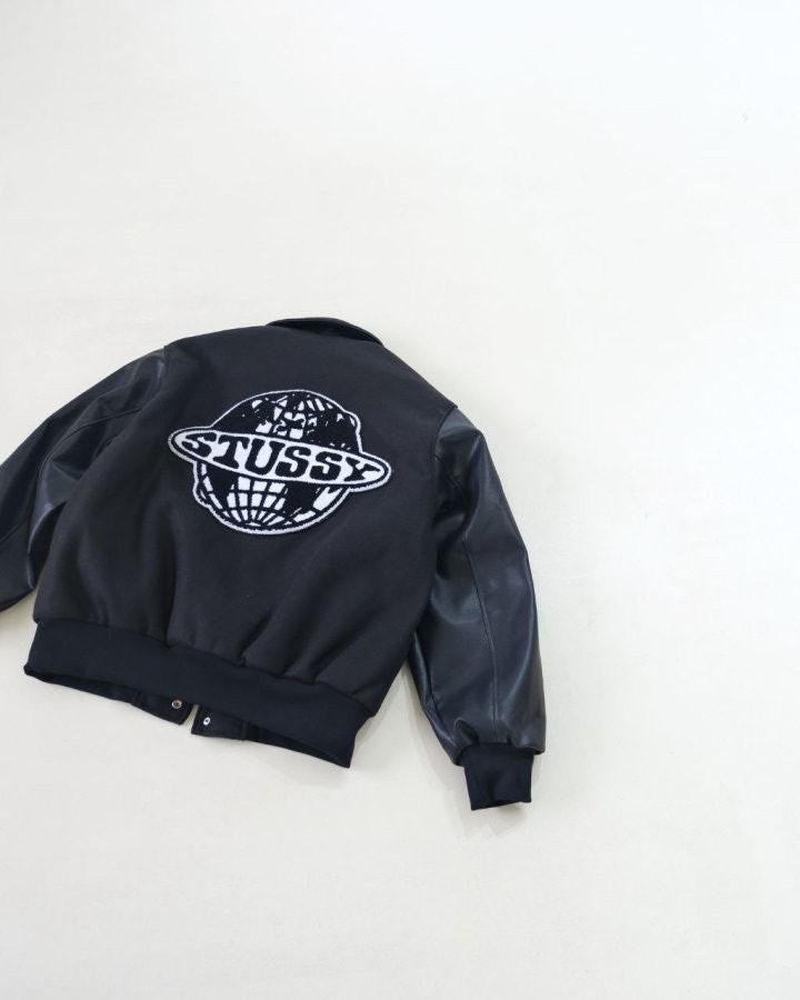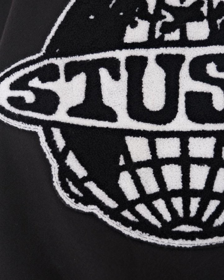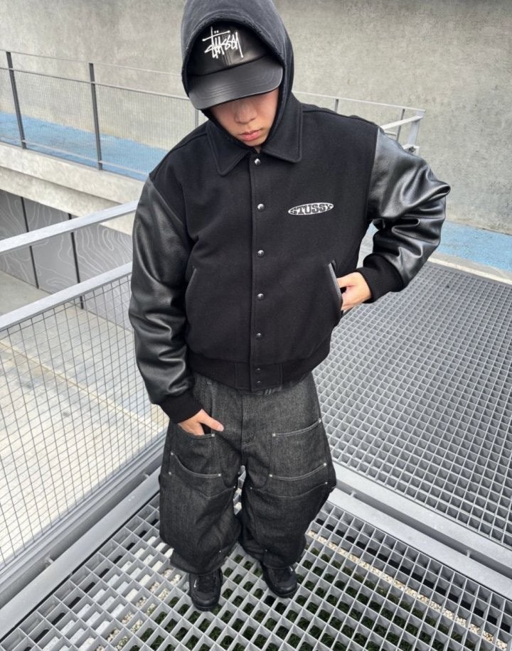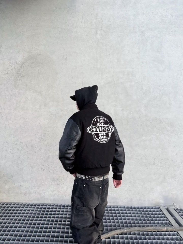 •Stus** FW25 GLOBE VARSITY 재킷은 로고 자수와 벨벳 셰니유 패턴, 가죽 디테일이 조화를 이룬 레더 바시티 재킷으로 이번 시즌 가장 소장 가치가 높은 아이템입니다. 활용도 높은 블랙 컬러로 제작되었으며, 디자인과 마감에서 Stus**의 클래식을 충실히 재현해 별도의 설명이 필요 없을 만큼 대표적인 작품이라 할 수 있습니다. 전체 실루엣은 남녀 공용 디자인의 여유 있는 설계로, 레글런이 아닌 전형적인 바시티 패턴을 따르며 착용했을 때 퀄리티 있는 무게감과 존재감이 느껴집니다.
