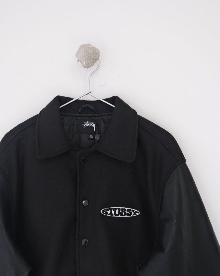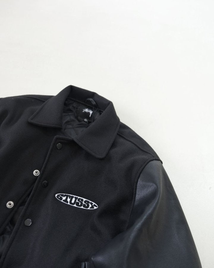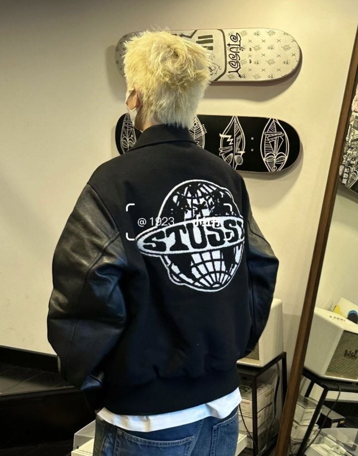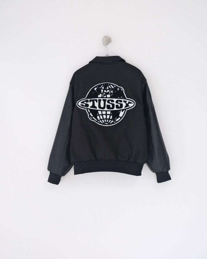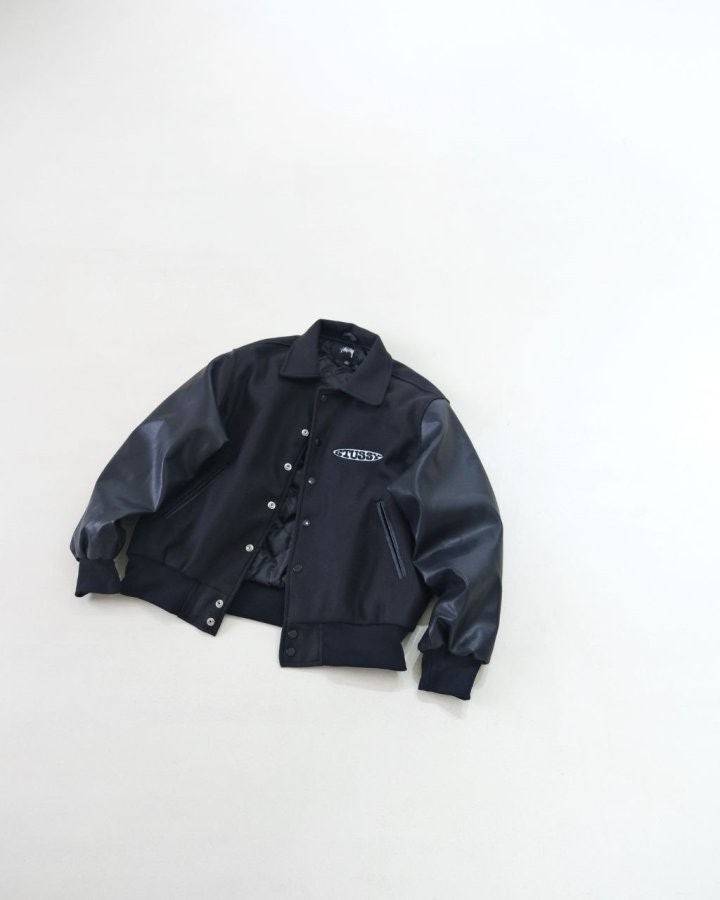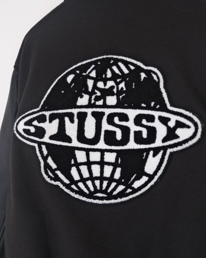 •Stus** FW25 GLOBE VARSITY 재킷은 로고 자수와 벨벳 셰니유 패턴, 가죽 디테일이 조화를 이룬 레더 바시티 재킷으로 이번 시즌 가장 소장 가치가 높은 아이템입니다. 활용도 높은 블랙 컬러로 제작되었으며, 디자인과 마감에서 Stus**의 클래식을 충실히 재현해 별도의 설명이 필요 없을 만큼 대표적인 작품이라 할 수 있습니다. 전체 실루엣은 남녀 공용 디자인의 여유 있는 설계로, 레글런이 아닌 전형적인 바시티 패턴을 따르며 착용했을 때 퀄리티 있는 무게감과 존재감이 느껴집니다.