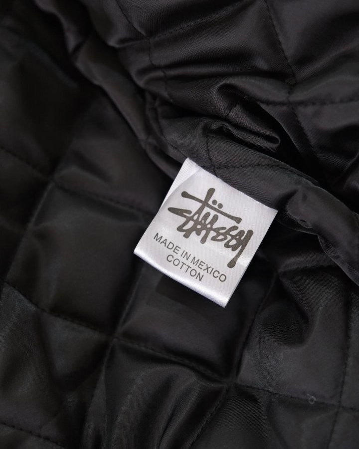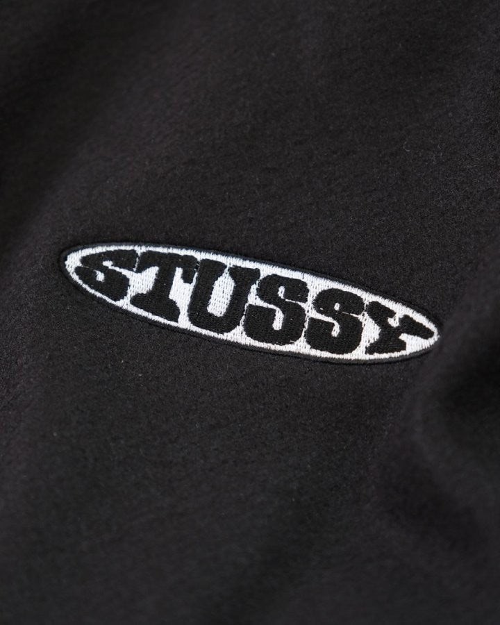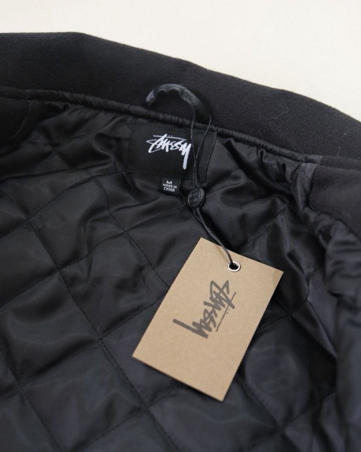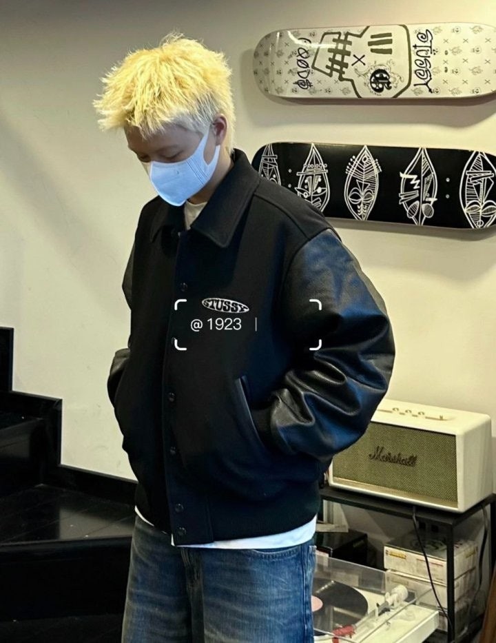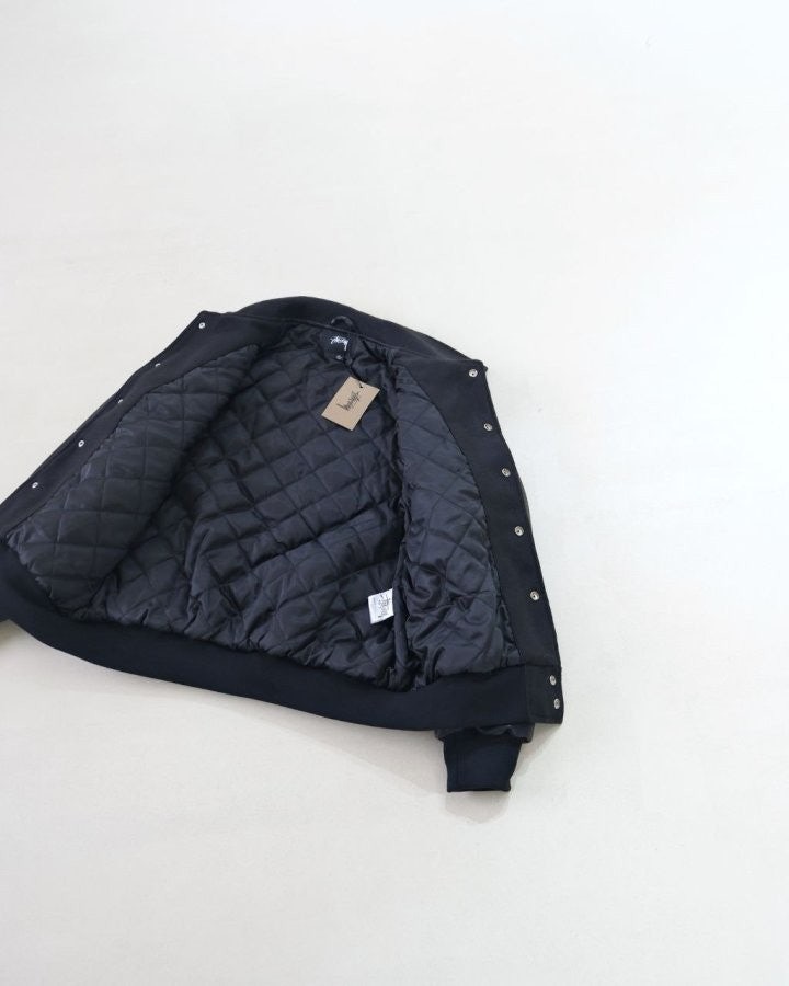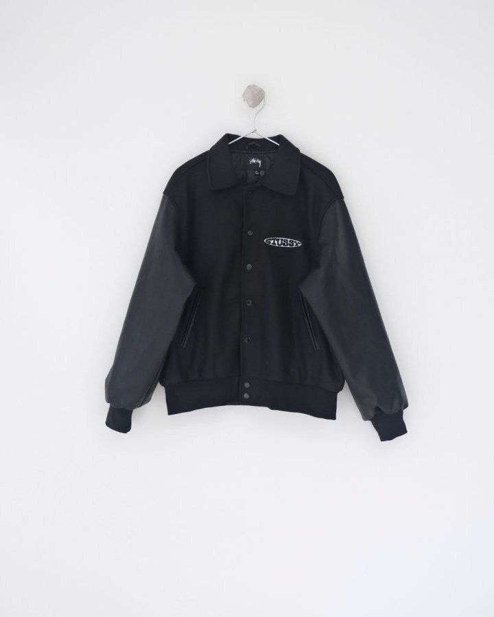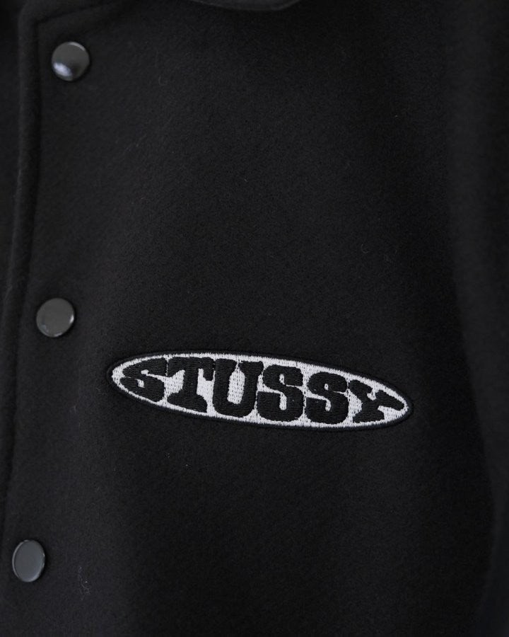 •Stus** FW25 GLOBE VARSITY 재킷은 로고 자수와 벨벳 셰니유 패턴, 가죽 디테일이 조화를 이룬 레더 바시티 재킷으로 이번 시즌 가장 소장 가치가 높은 아이템입니다. 활용도 높은 블랙 컬러로 제작되었으며, 디자인과 마감에서 Stus**의 클래식을 충실히 재현해 별도의 설명이 필요 없을 만큼 대표적인 작품이라 할 수 있습니다. 전체 실루엣은 남녀 공용 디자인의 여유 있는 설계로, 레글런이 아닌 전형적인 바시티 패턴을 따르며 착용했을 때 퀄리티 있는 무게감과 존재감이 느껴집니다.