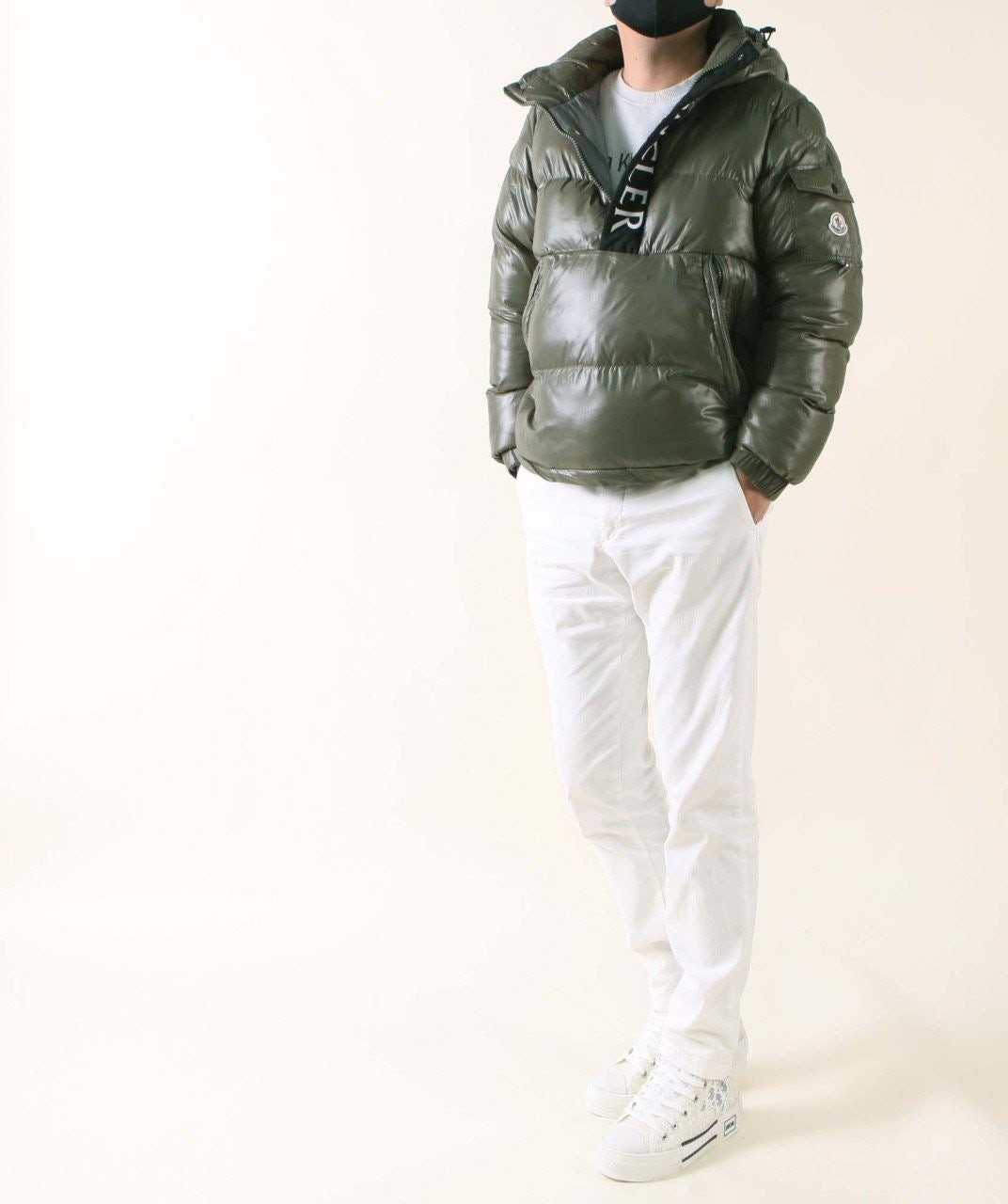 레트로풍의 하프 지퍼는 브랜드 로고가 새겨진 레터링으로