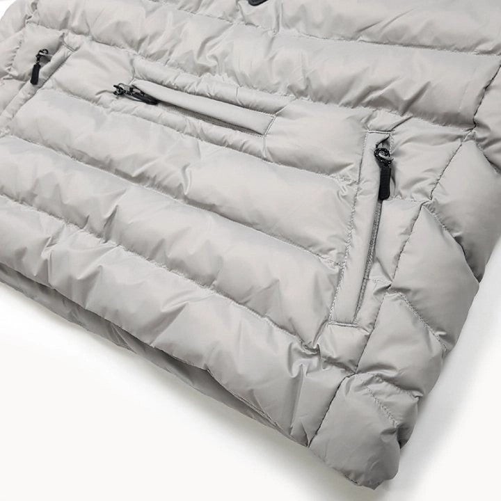 기존 경량 패딩과 다르게 아노락으로 제작 되어서 더 매력적인 경량패딩입니다. 전면부 앞포켓 디테일로 수납력을 높였으며 100% 나일론 원단으로 생활 방수 가능 한 제품입니다.