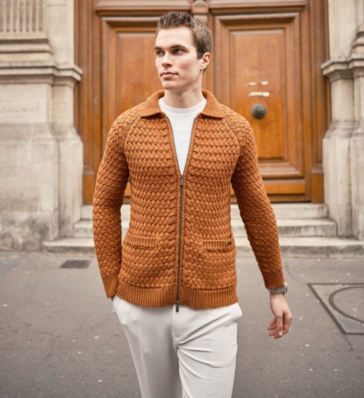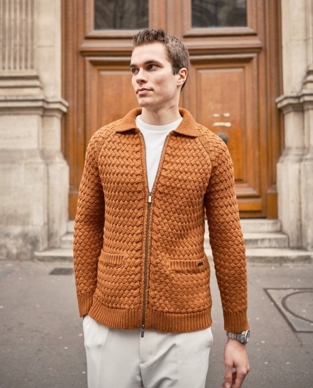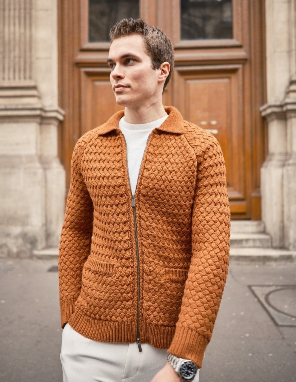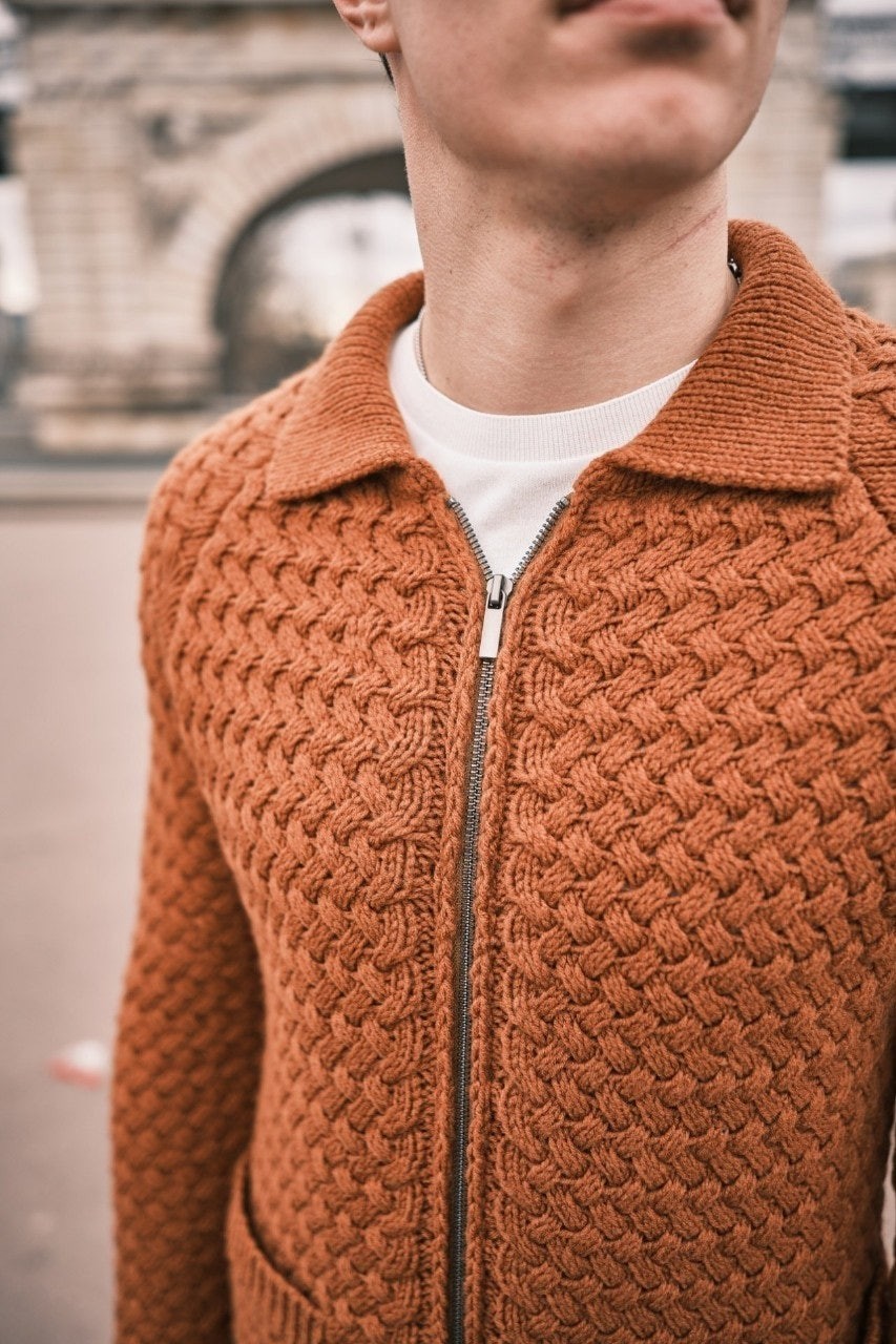 이태리 현지 최상급 공장에서 제작후 힘든 매듭 가공법을 이태리 공장 기술력으로 실현하여 니트자켓의 한계성을 뛰어넘은 수준 높은 퀄리티를 보여주는 니트우븐집업 이라고 할수 있습니다.