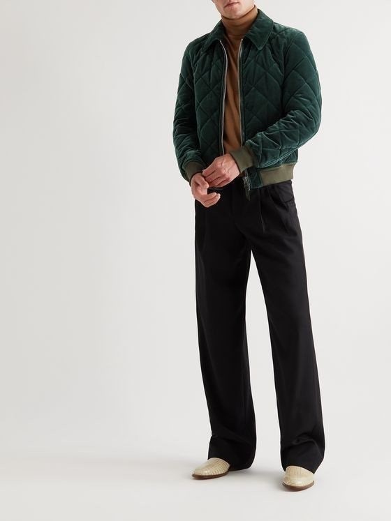 톰**는 보기에도 좋고 입기에도 편안한 우아한 아우터웨어를 제작합니다. 이 블루종 재킷은 부드러운 코튼 벨벳 소재에 패딩 처리하여 보온성과 볼륨감을 더했으며, 진한 청록색 톤으로 출시되었습니다. 아미 그린 가죽 트리밍이 돋보이는 박시한 실루엣으로 슬림핏 팬츠와도 잘 어울립니다.