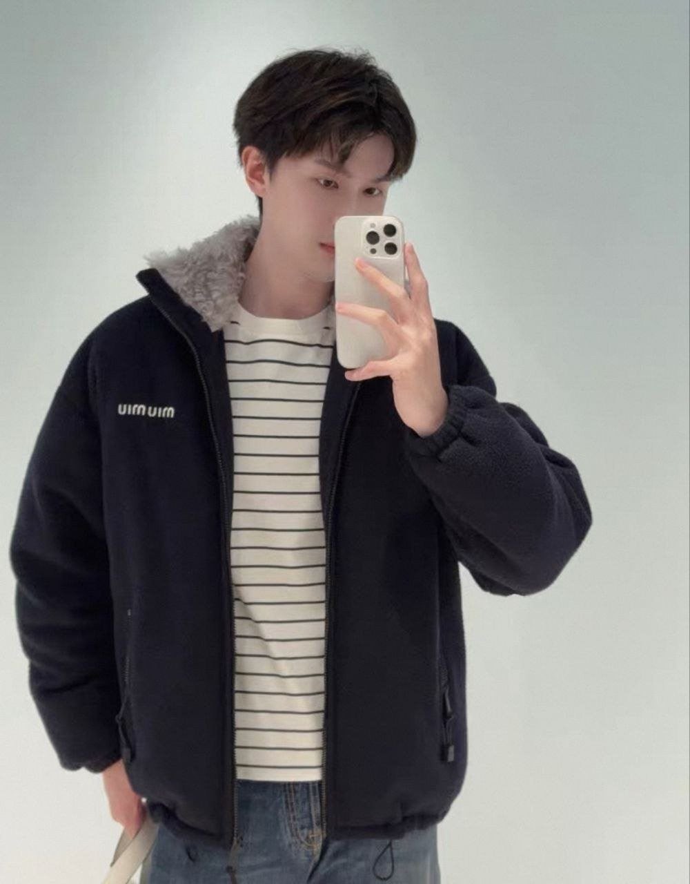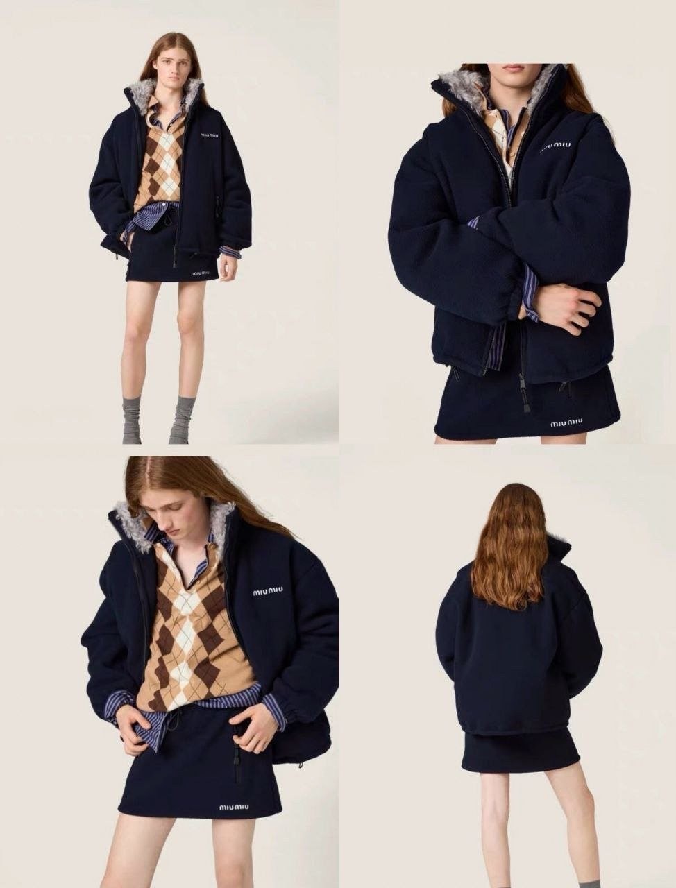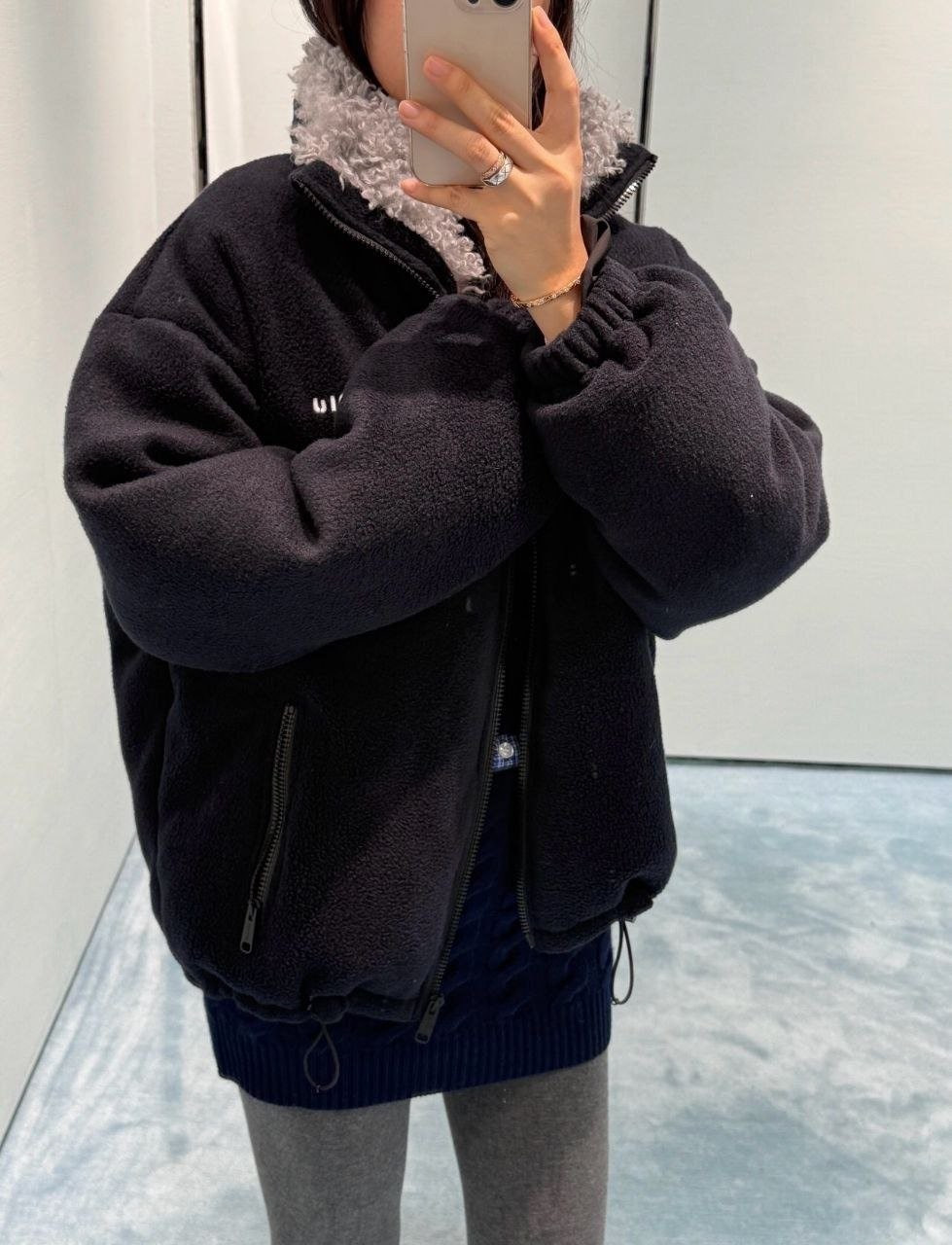 •MI* MI*(미***) FW 시즌의 양털 칼라 플리스(쉐퍼드)와 보아 플리스 배색이 들어간 네이비 컬러 플리스 다운 재킷입니다. 원단은 맞춤 염색한 짙은 남색 플리스(폴라플리스)를 사용했고, 칼라 부분은 맞춤 제작한 크림빛 그레이 색상의 양털(램스울) 배색으로 고급스럽게 마감했습니다. 안쪽 충전재는 100g 충전량에 기준의 90% 화이트 덕다운을 사용하였고, 전체 패턴과 실루엣은 오리지널 매장과 동일하게 재현되어 있으며 ZP 동일하게 사이즈는 다소 크게(오버사이즈) 제작되었습니다.