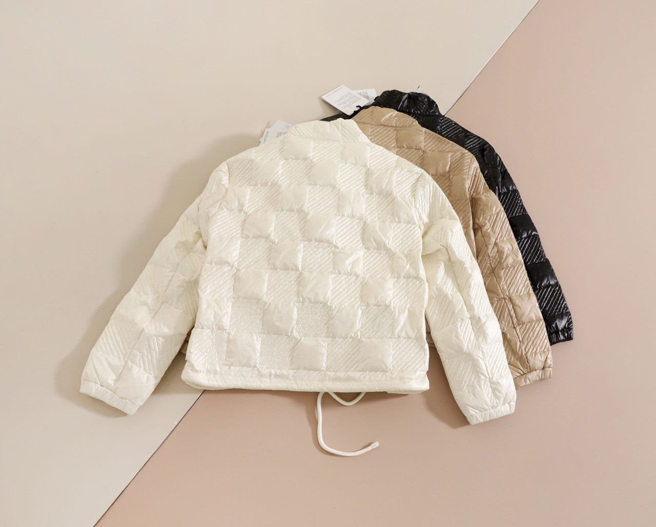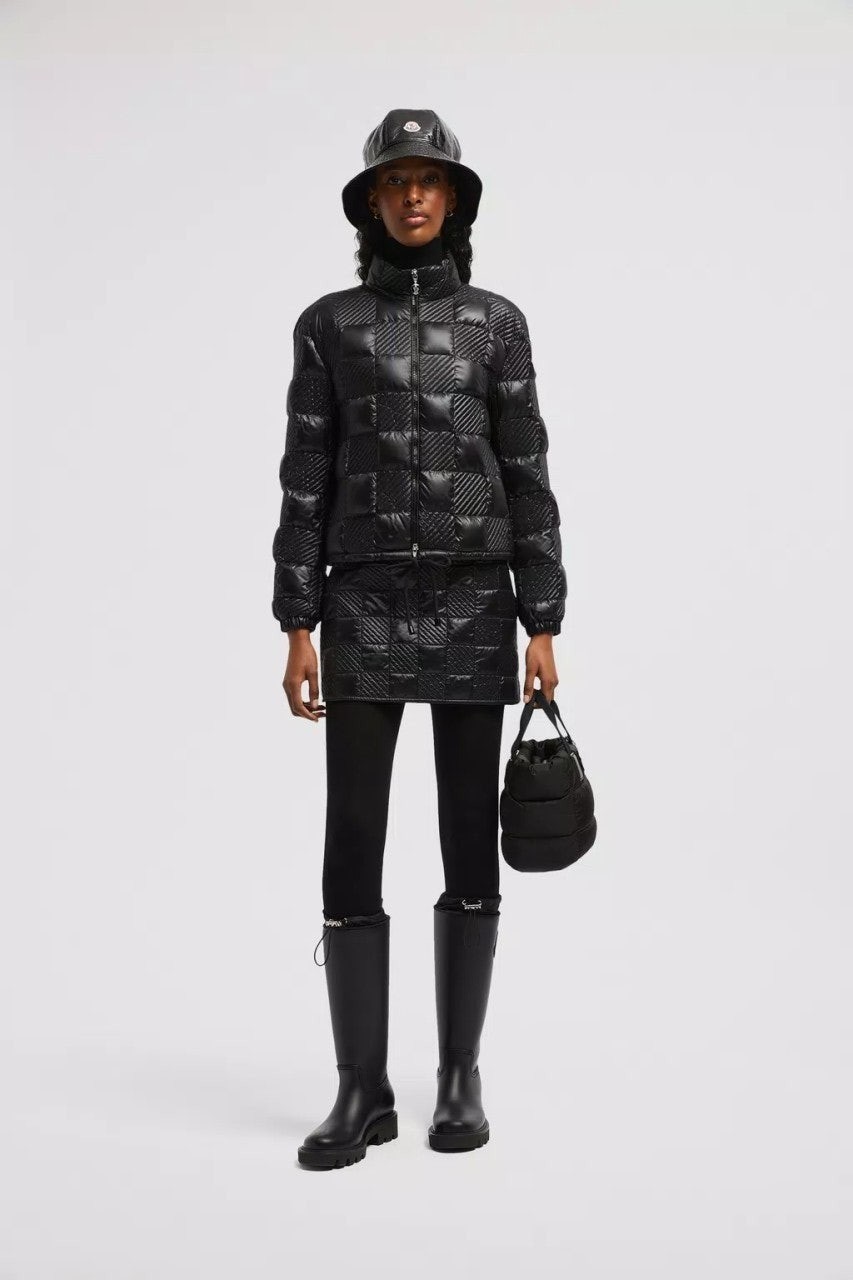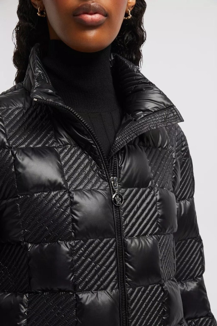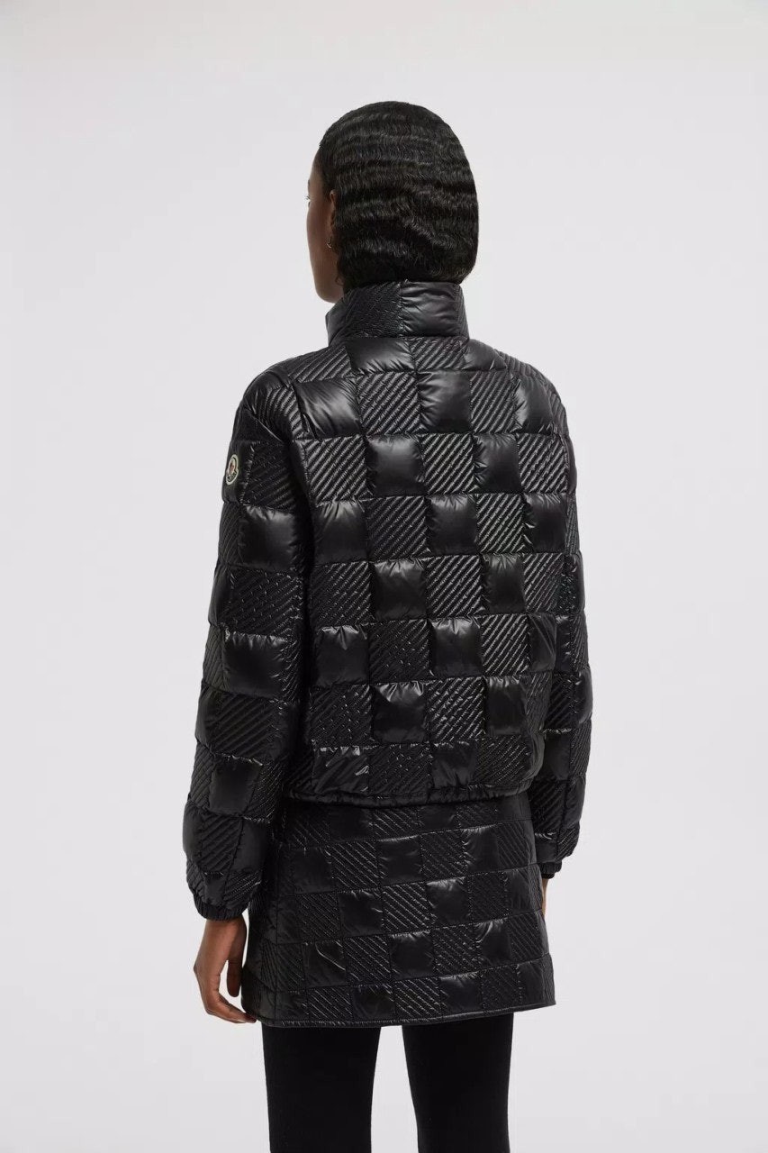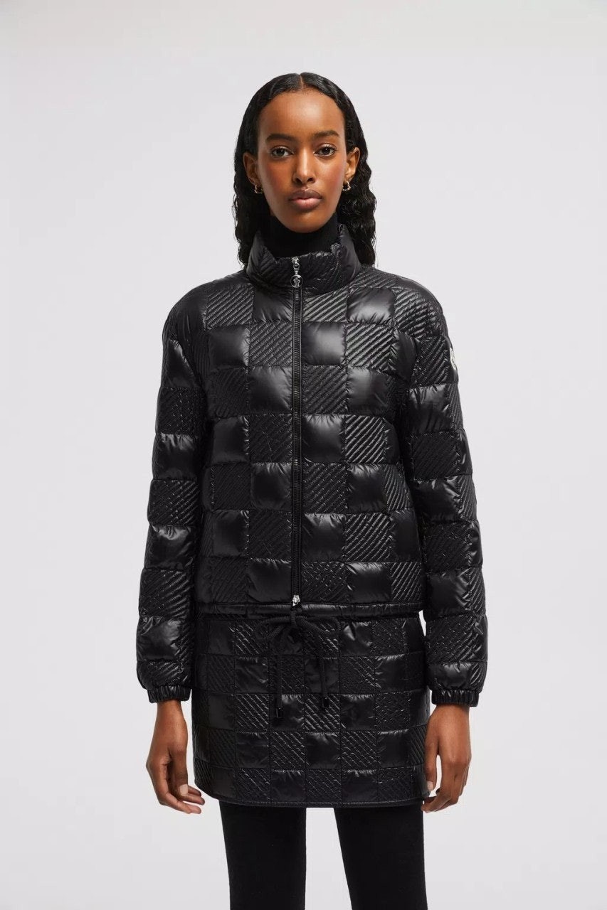 60년대에서 영감을 받은 이 롱 재킷은 퀼팅 체커보드 모티브가 특징입니다.