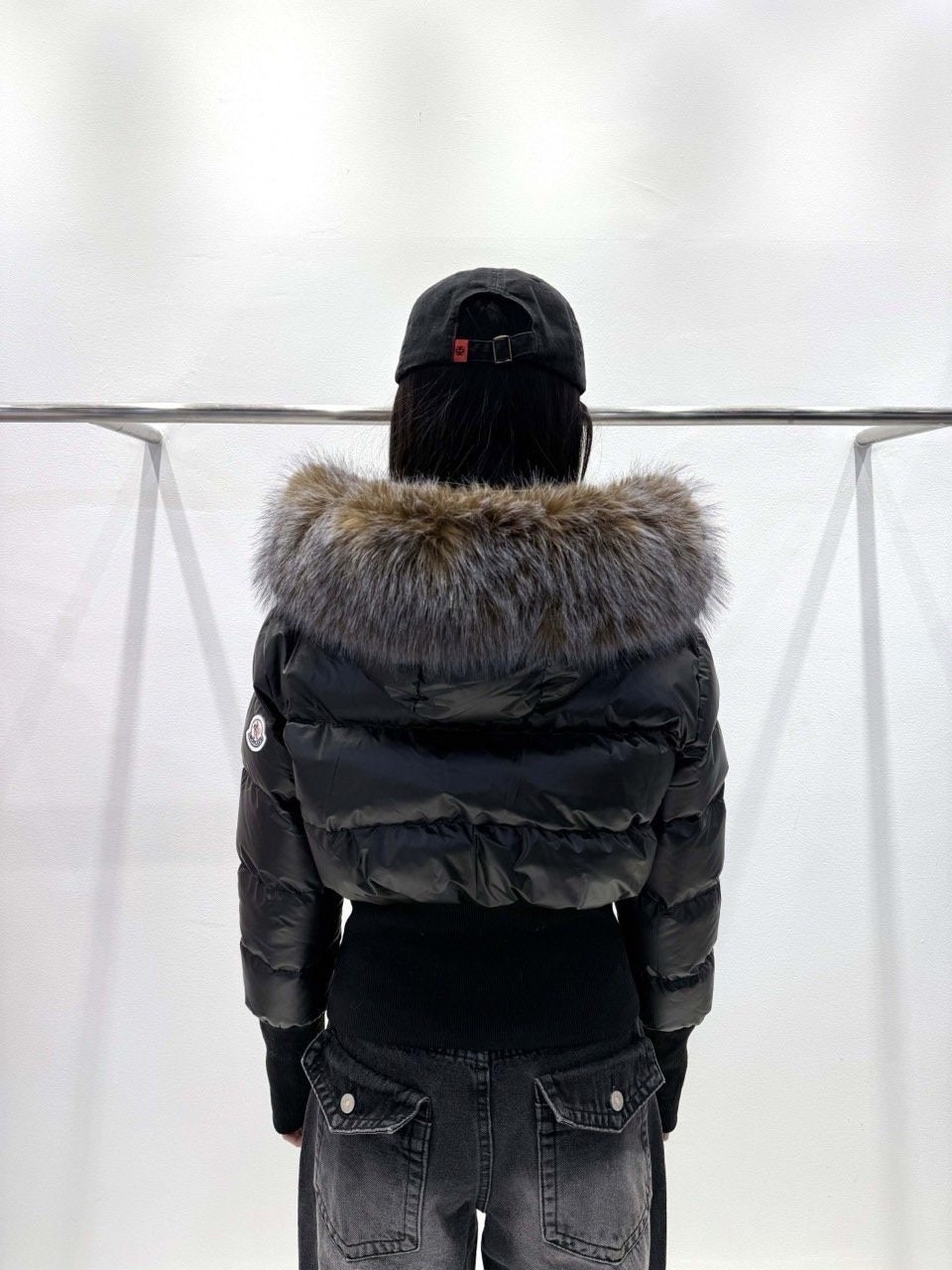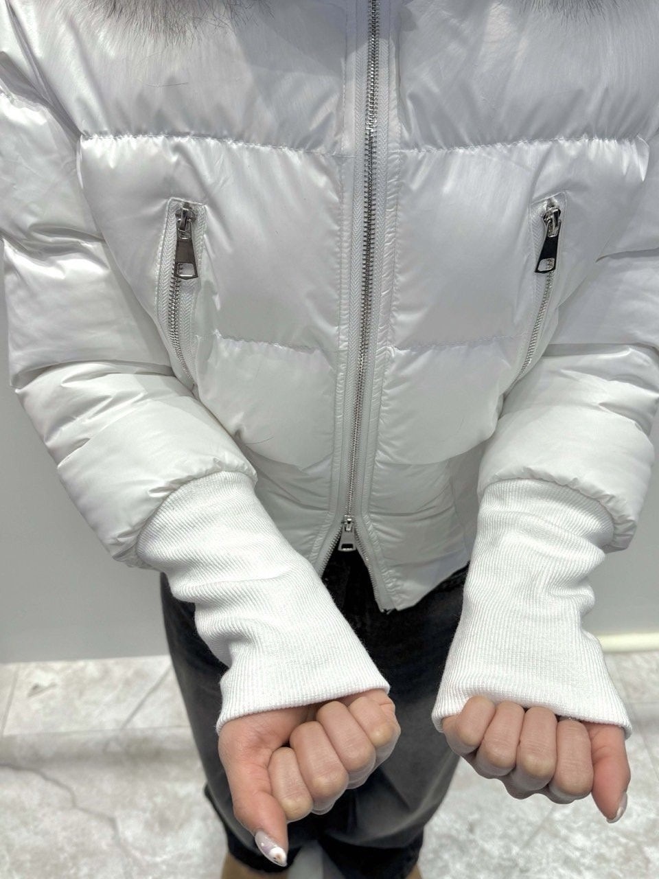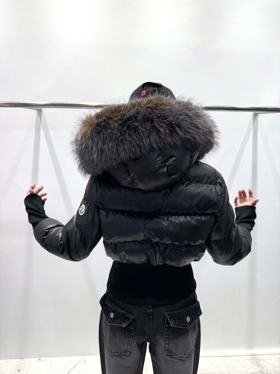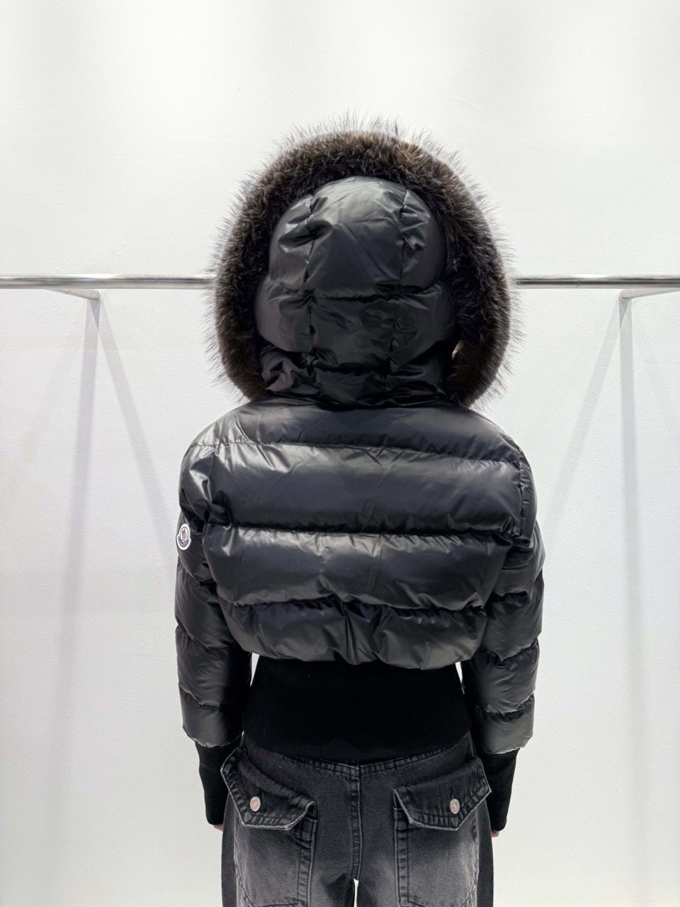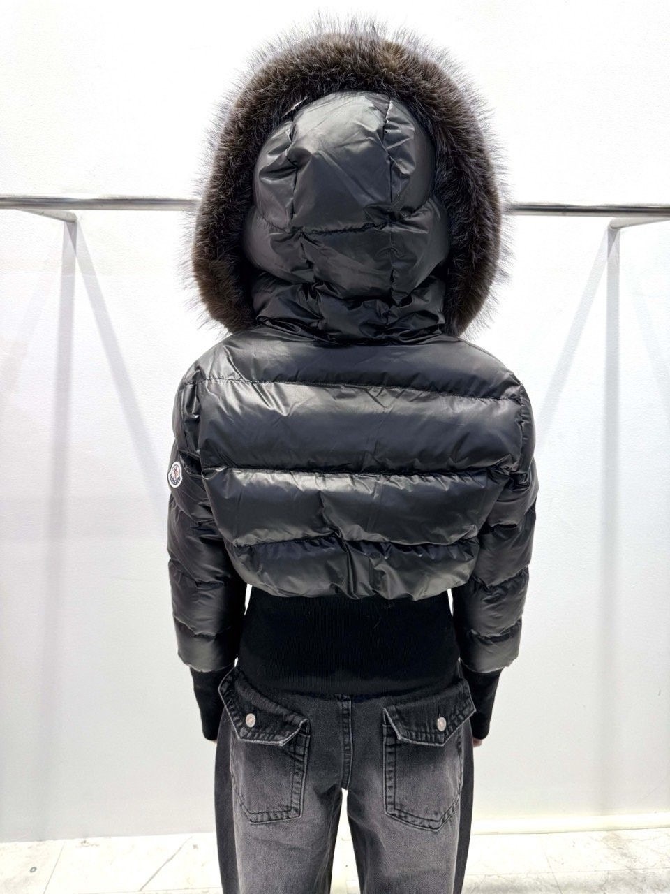 퍼 후드 디테일로 포근하게 입기 좋은 글로시 크롭 퍼 패딩 제품입니다.