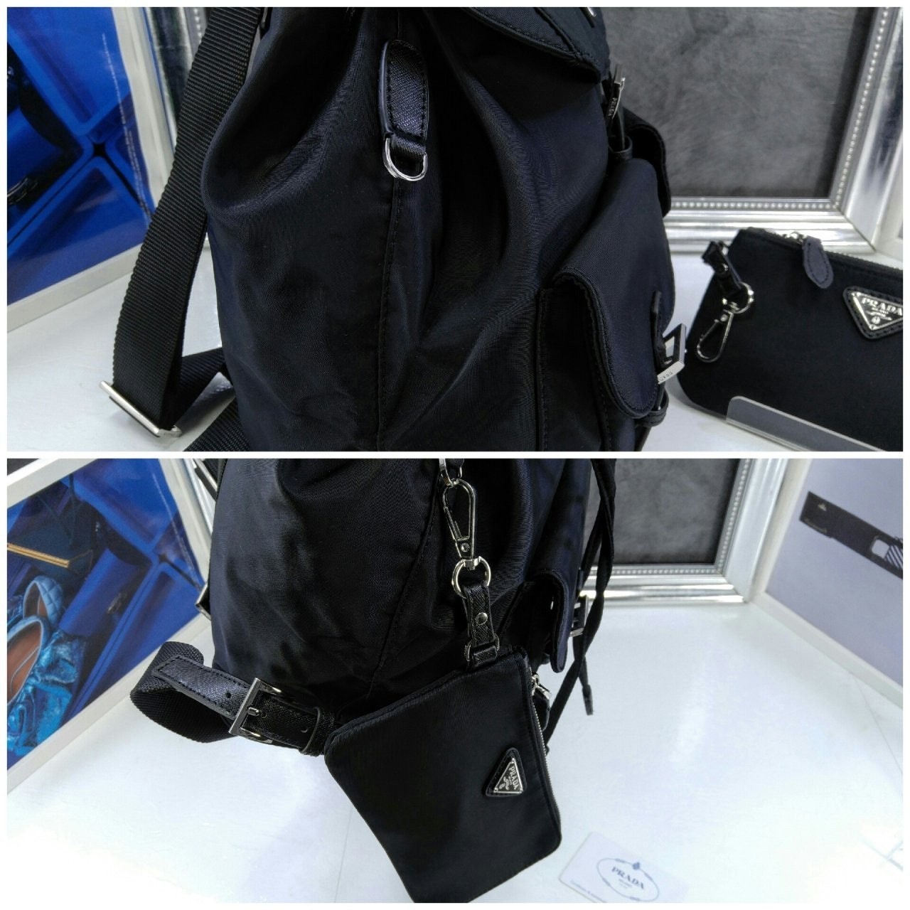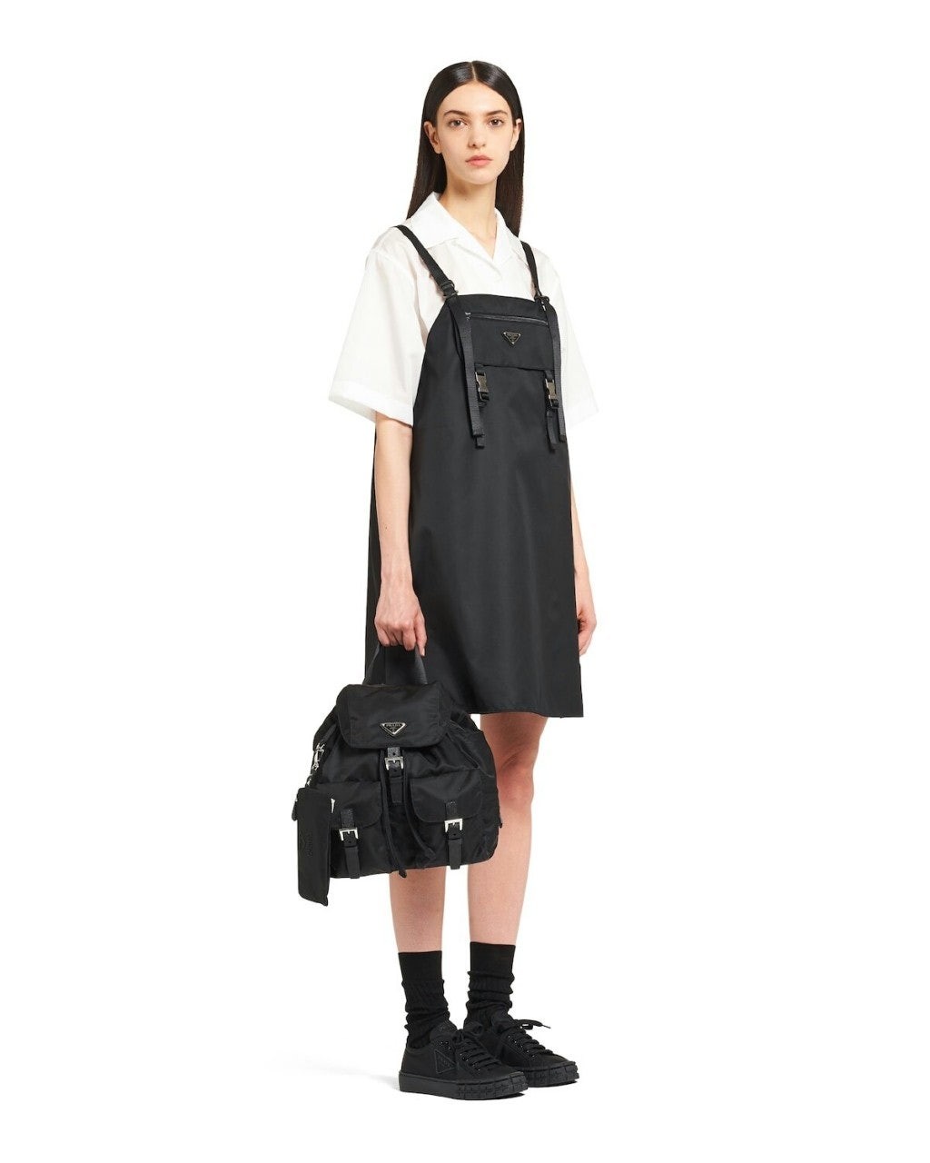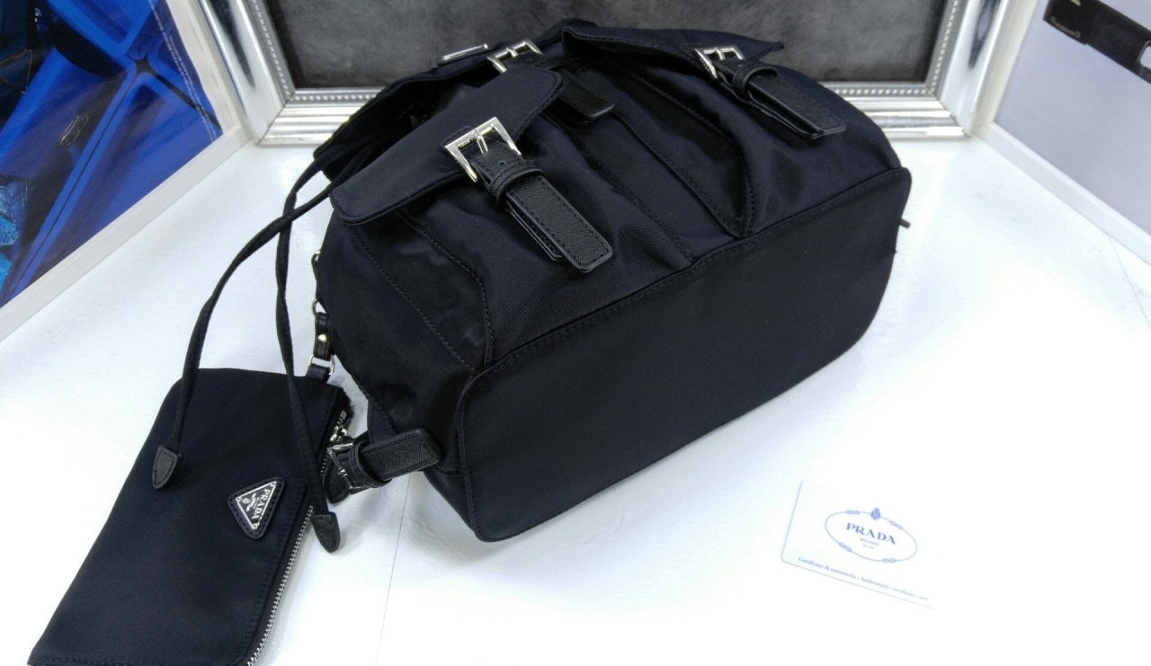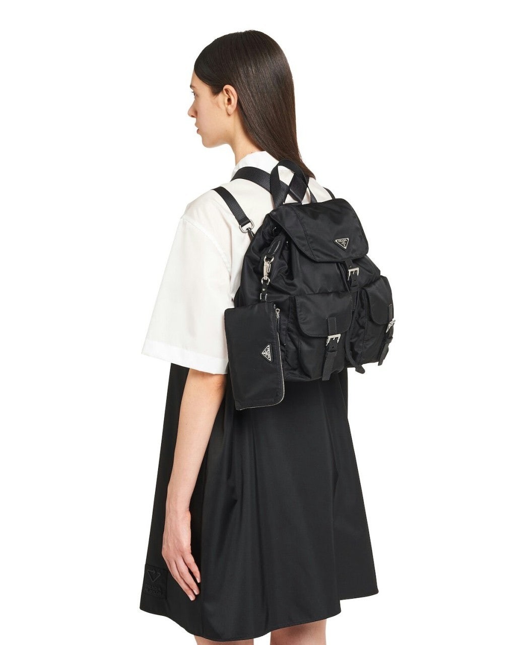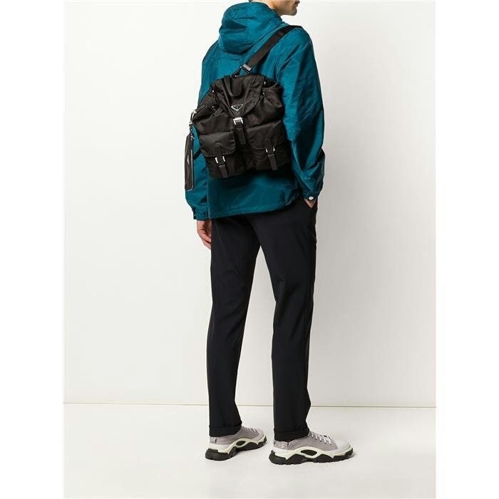 세련된 사피아노 가죽 트리밍 장식이 있는 나일론 백팩으로, 여러 재료를 조합해 모던한 매력과 변하지 않을 우아함을 표현했습니다. 메탈 트라이앵글 로고가 장식되어 있습니다.
