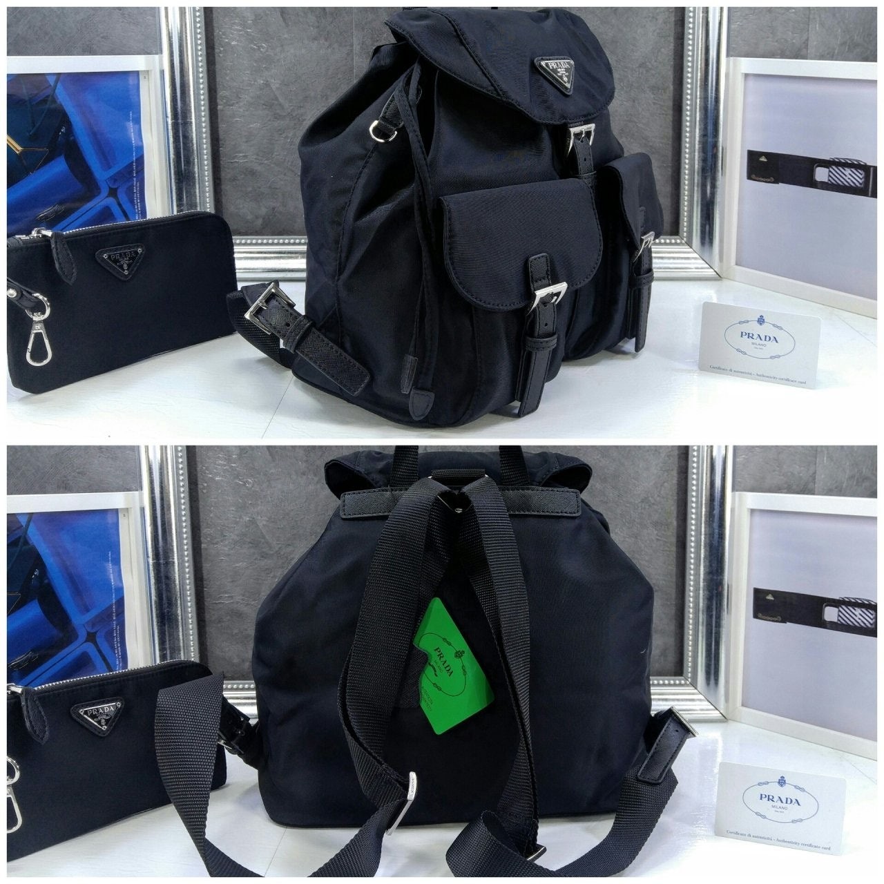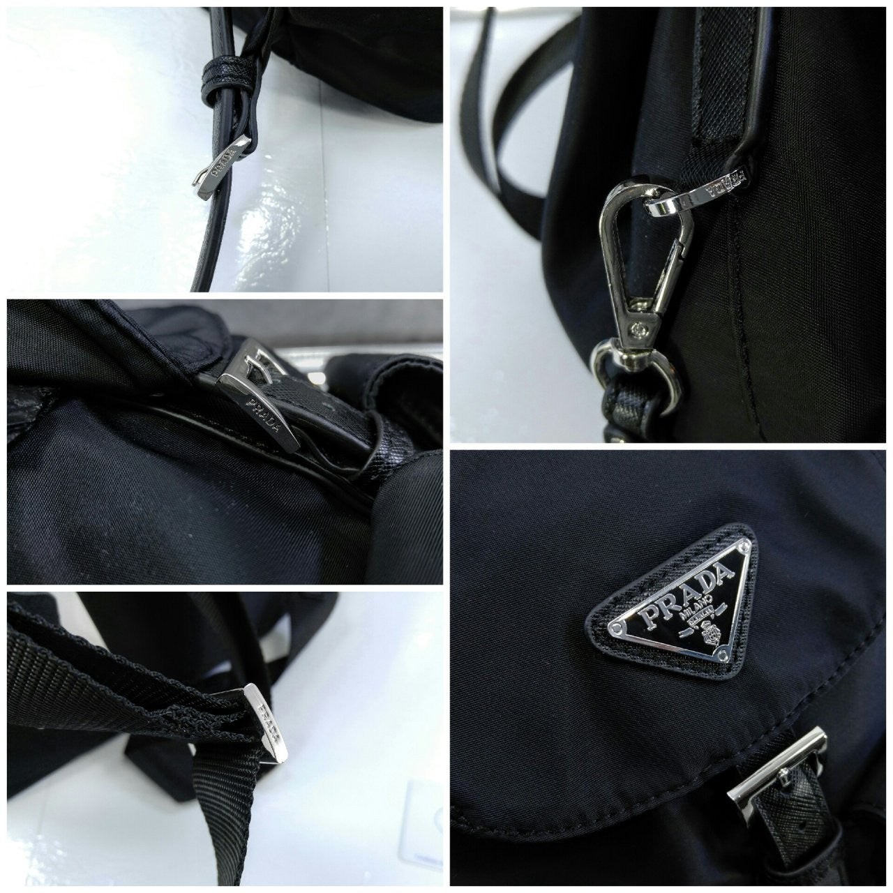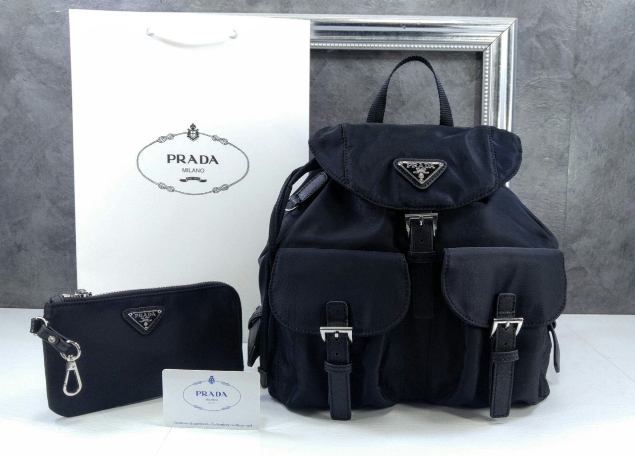 세련된 사피아노 가죽 트리밍 장식이 있는 나일론 백팩으로, 여러 재료를 조합해 모던한 매력과 변하지 않을 우아함을 표현했습니다. 메탈 트라이앵글 로고가 장식되어 있습니다.