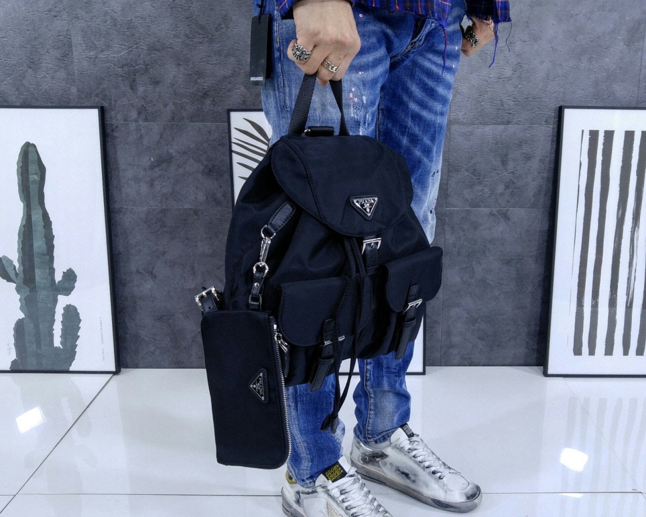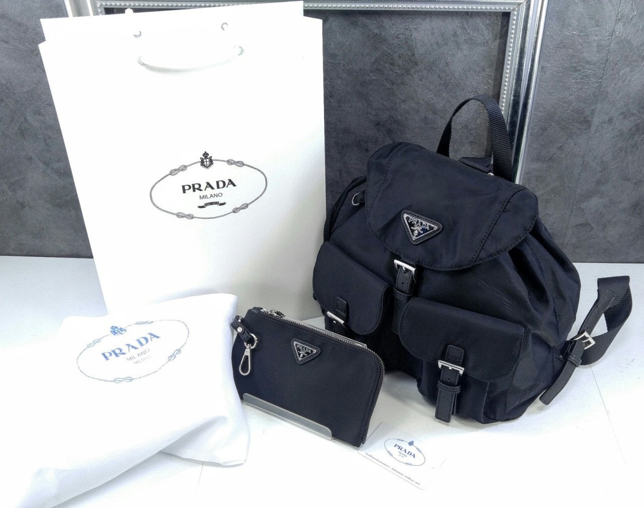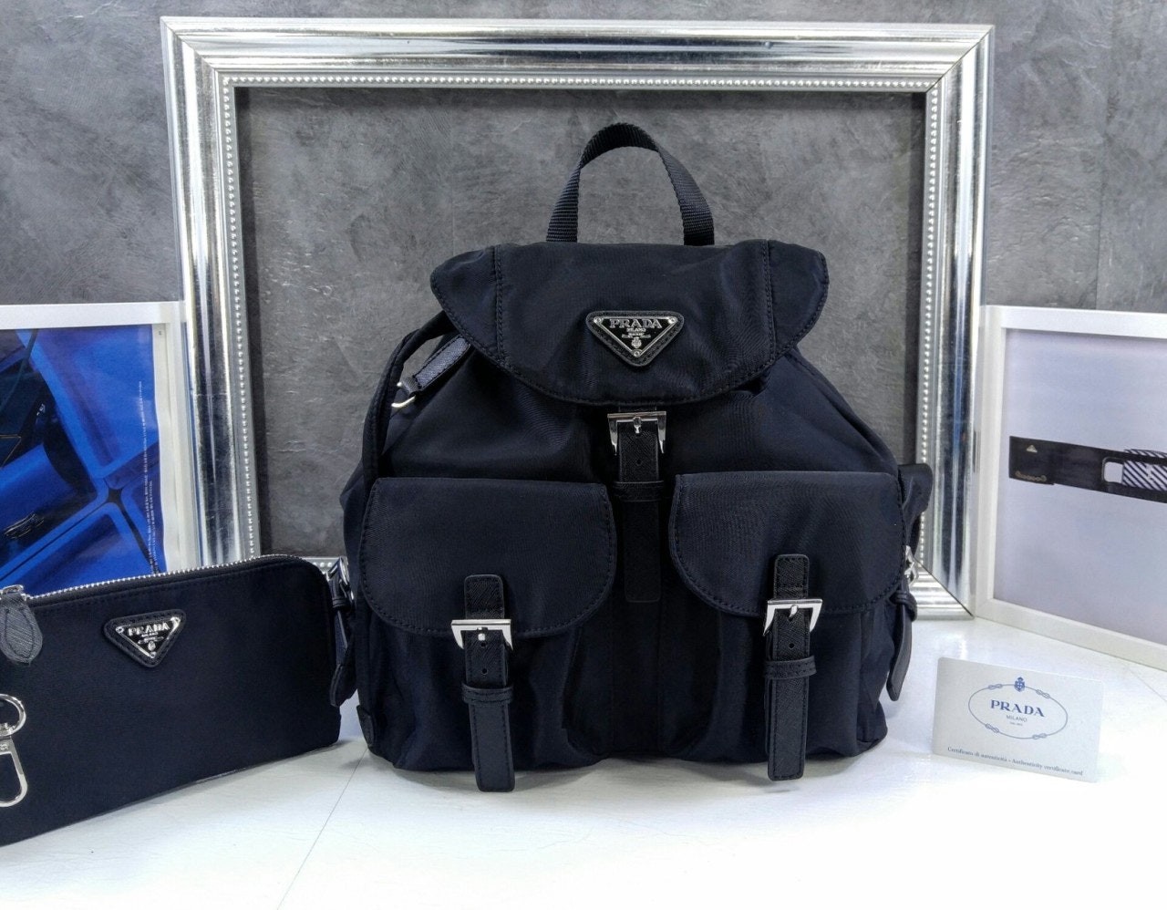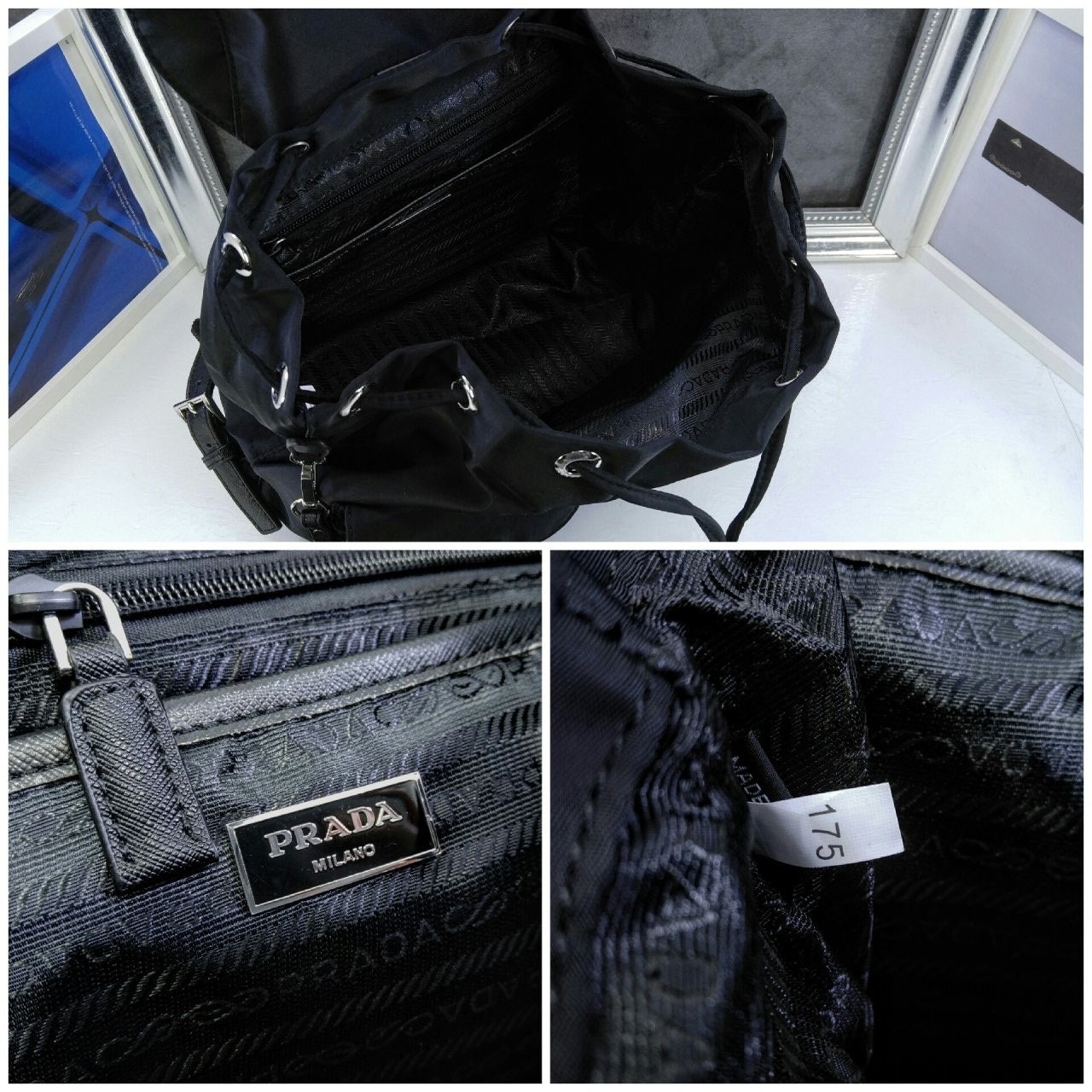 세련된 사피아노 가죽 트리밍 장식이 있는 나일론 백팩으로, 여러 재료를 조합해 모던한 매력과 변하지 않을 우아함을 표현했습니다. 메탈 트라이앵글 로고가 장식되어 있습니다.