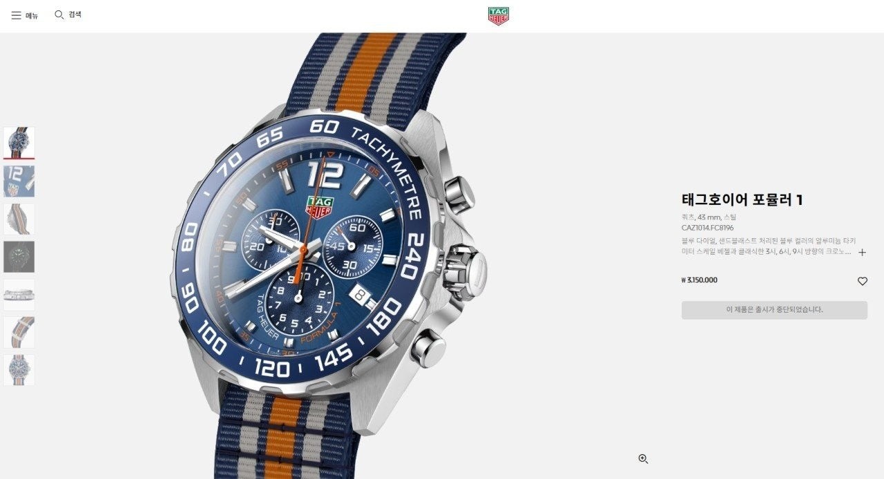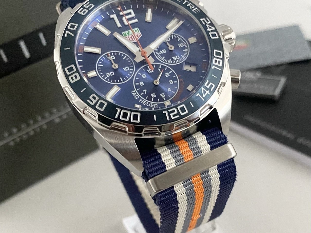 ✔️43mm 크로노그래프 스포츠 시계. 최신 트렌드를 반영한 나토 스트랩은 중앙의 오렌지 스트라이프와 소박한 두 줄의 그레이 스트라이프와 어울리는 블루 컬러입니다.