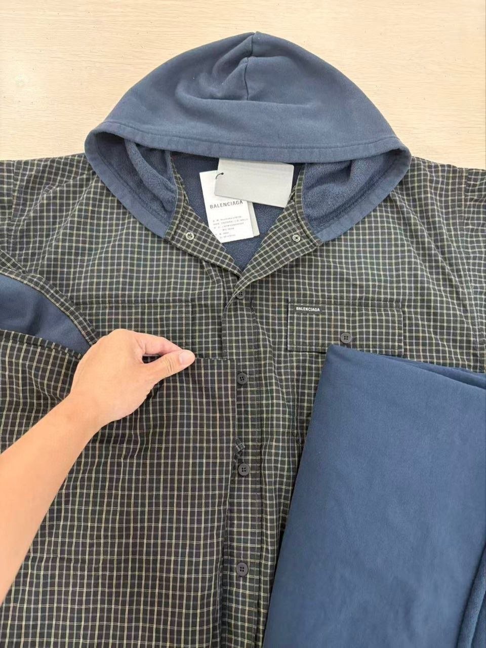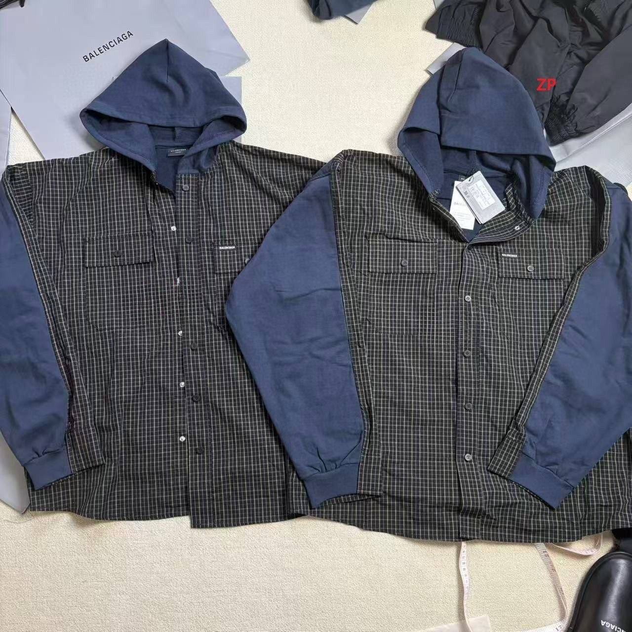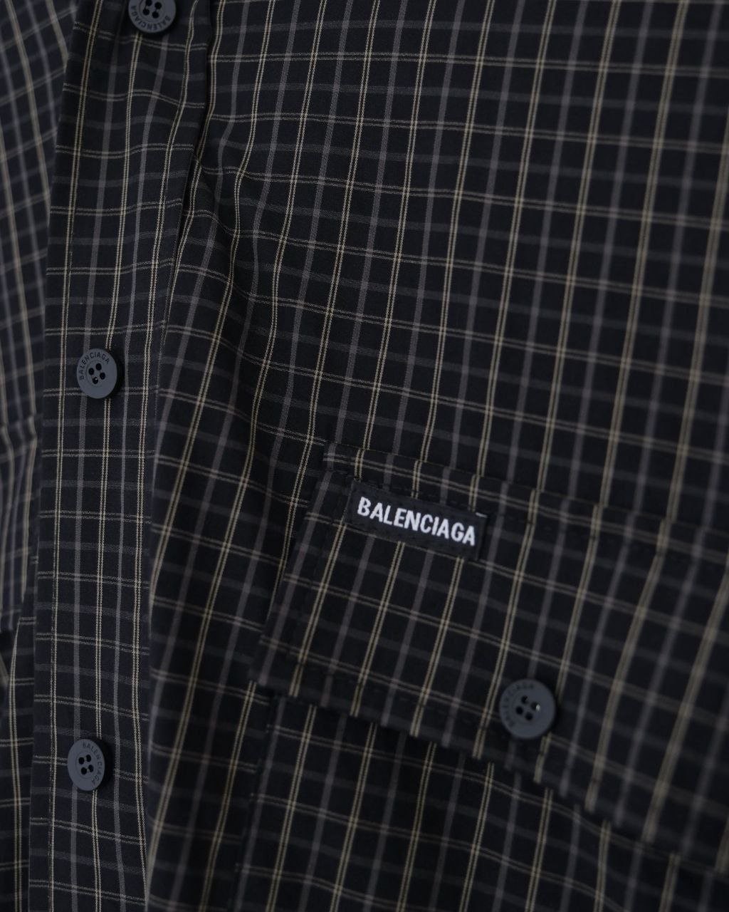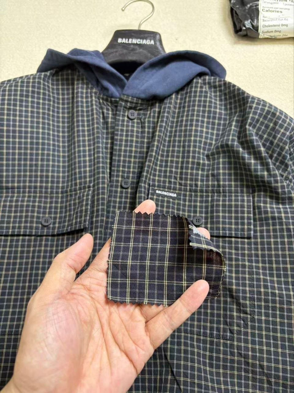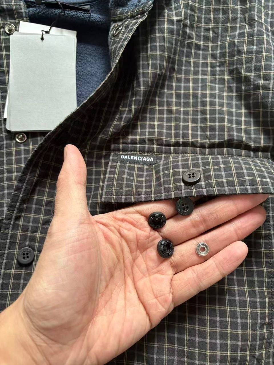 •Balencia**(발****) 25FW 체크 포켓 셔츠 재킷으로, 여러 연예인과 셀럽 들이 착용한 스타일입니다. 오리지널을 바탕으로 개발했으며, 면으로 직조한 컬러 원단을 패널별로 짜 맞춘 뒤 니트 공정을 더한 스페셜 기법을 적용해 위치별 재단과 봉제가 정확하게 맞아떨어지도록 제작했습니다. 원단 소모가 크고 공정이 많은 편이며, 여덟 똑딱이 버튼 금속 장식과 YB(원본) 사양을 일치시켰습니다. 완성 후에는 워싱과 효소 처리를 통해 빈티지한 느낌을 살렸고, 패턴과 실루엣은 오리지널 버전과 동일해 착용 시 자체적으로 스트릿한 무드를 연출합니다. 전체적으로 표준적인 넉넉한 루즈핏입니다.