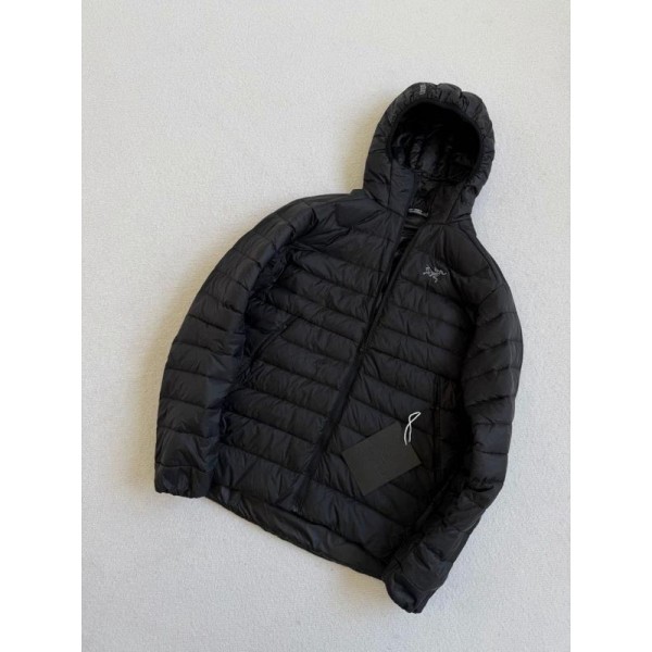 •Arcter**(아크테릭*) Cerium 850 필파워 구스다운 경량 방풍 보온 후드 재킷 입니다. 옷 전체에 초경량 원단과 충전재를 사용해 매우 작게 압축할 수 있으며, 옷 안쪽 가슴 포켓에 내장된 수납 파우치에 넣어 보관할 수 있습니다. 수납 시 크기는 중간 맥주캔(중간 크기 캔) 정도로 작아 휴대가 편리합니다. 초경량으로 활동 시 제약이 거의 없고(제품별·사이즈별 충전량은 약 200–250g 내외로 상이함) 얇지만 보온성과 방풍성은 뛰어납니다. 진정한 다운의 보온성을 잘 살린 제품입니다.