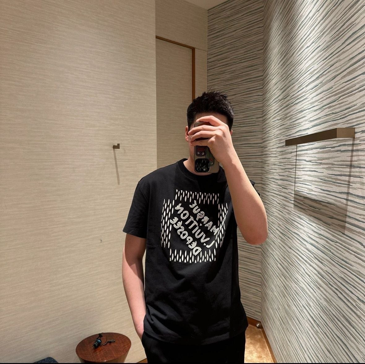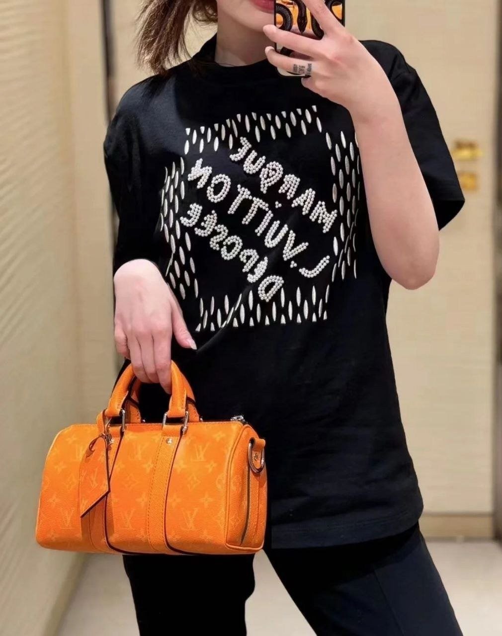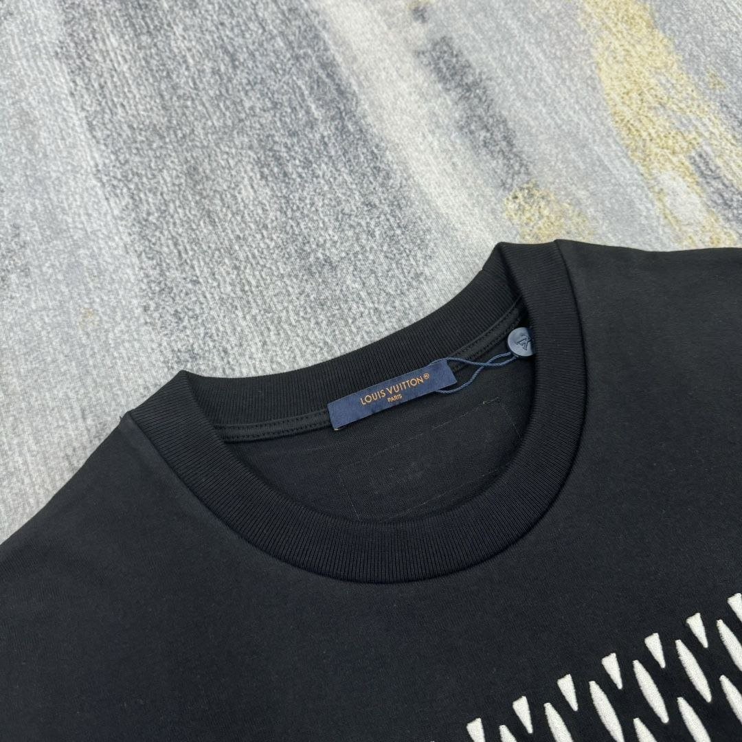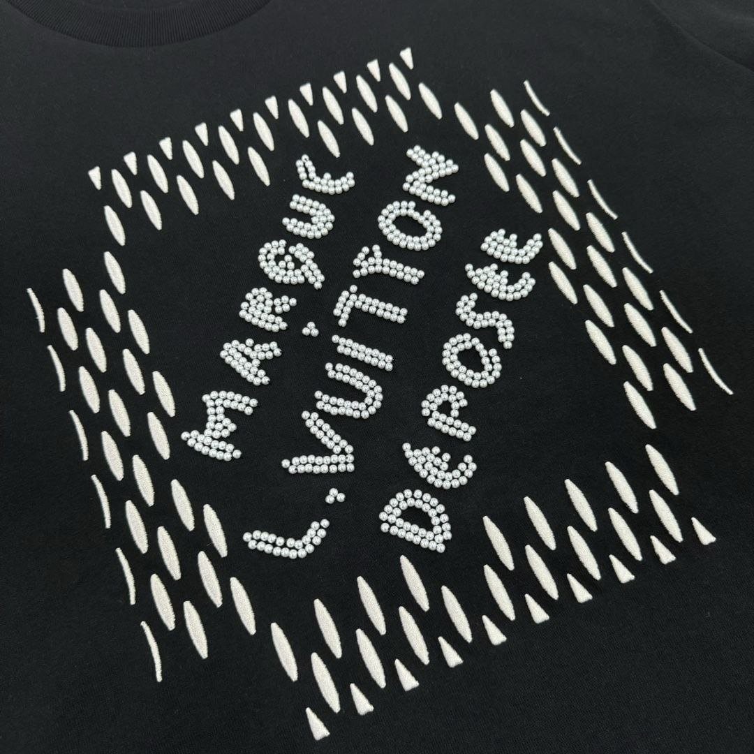 •봄,여름 패션쇼에서 퍼렐이 아카이브에서 영감을 받아 소개한 시그니처를 담아 선보인 티셔츠 입니다. 스마트한 블랙 색상과 진주와 원사를 수놓아 특유의 댄디한 테마를 담아낸 디자인으로 진주를 수놓은 뒷면의 인사이드 아웃 라벨과 캐주얼한 룩에 세련된 매력을 더해줄 아이템입니다.