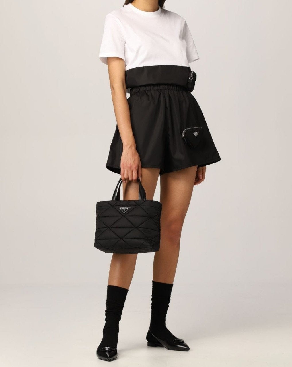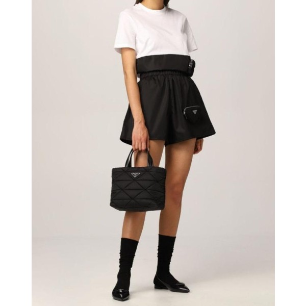 프** 고급 리나일론 나파 트라이앵글 퀼팅 패딩 더블핸들 지퍼 포켓 토트 블랙