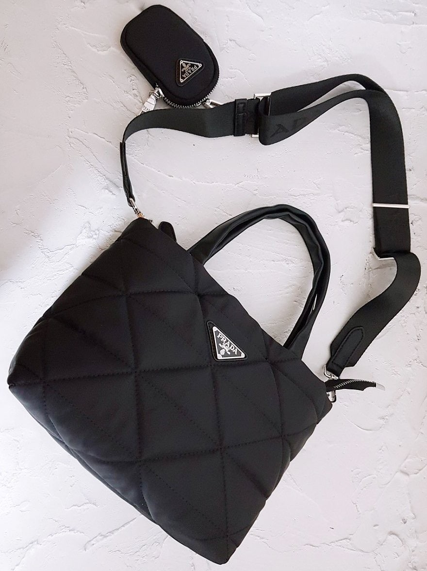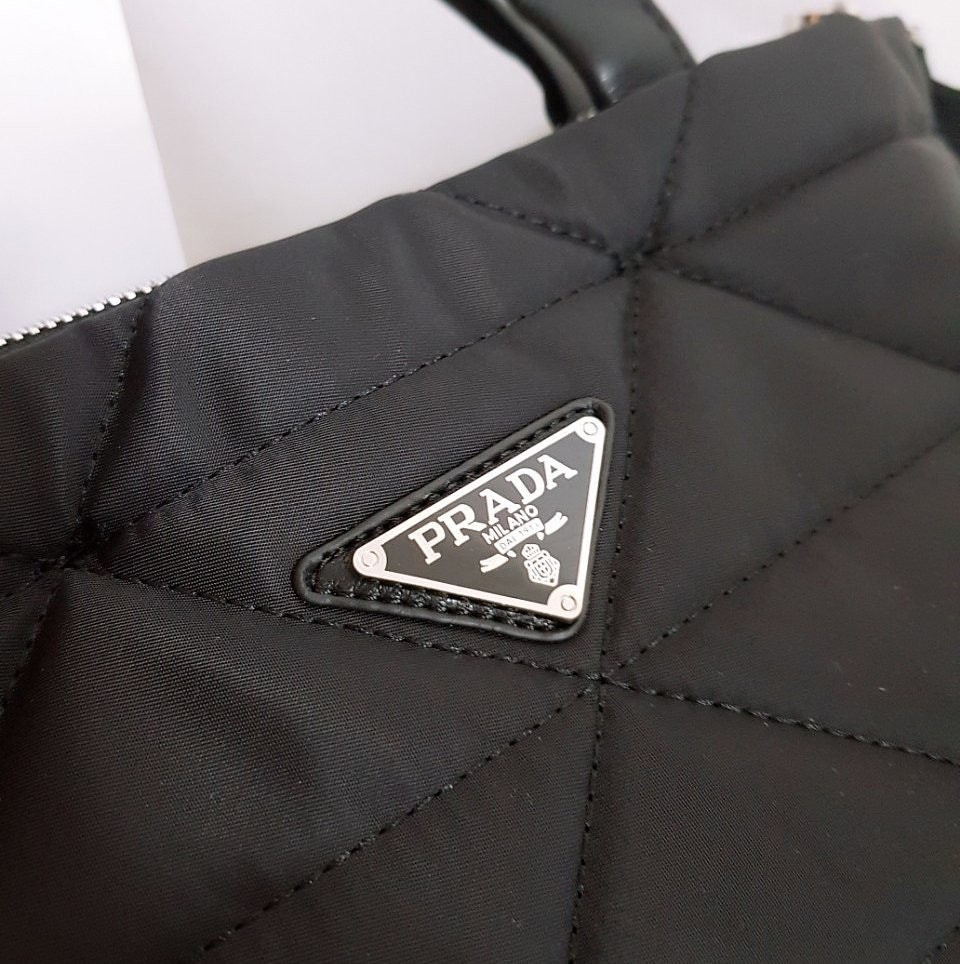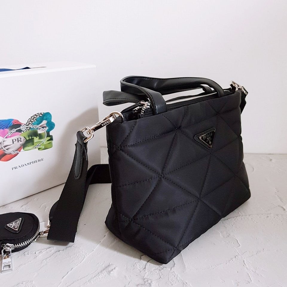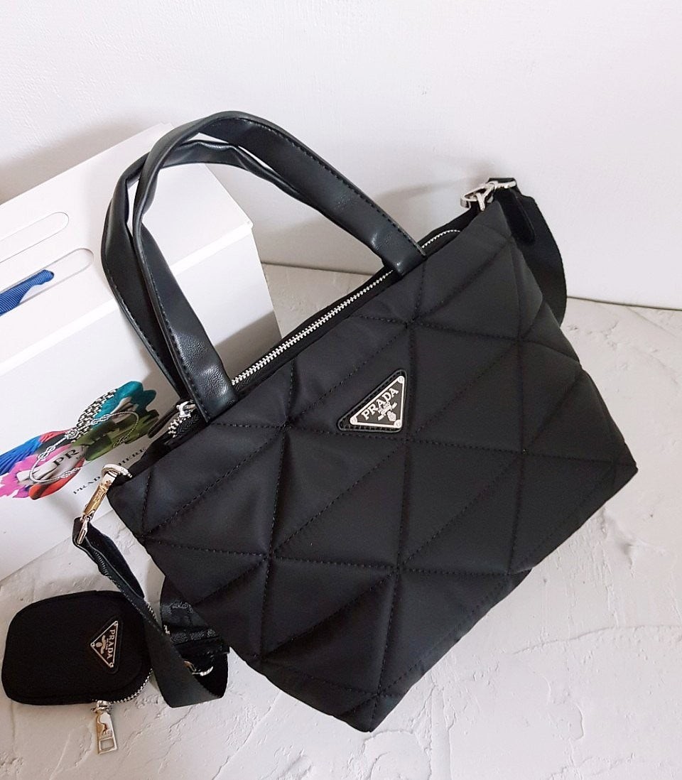 • 프** 고급 리나일론 나파 트라이앵글 퀼팅 패딩 더블핸들 지퍼 포켓 토트 블랙