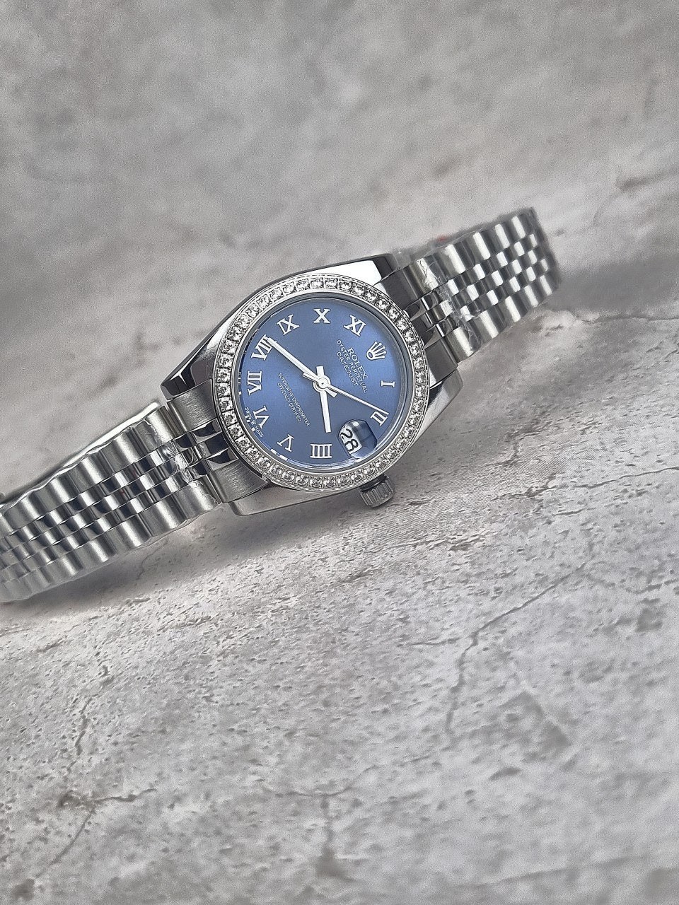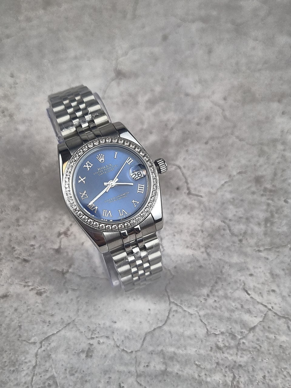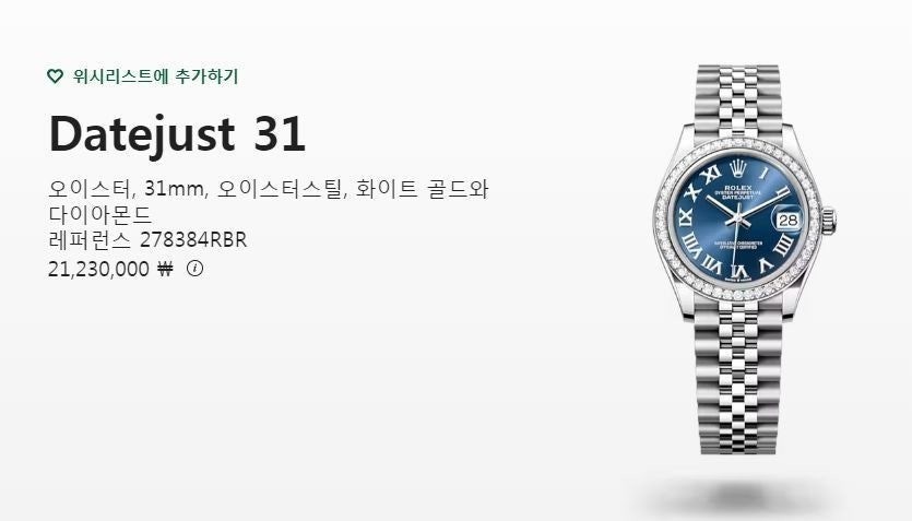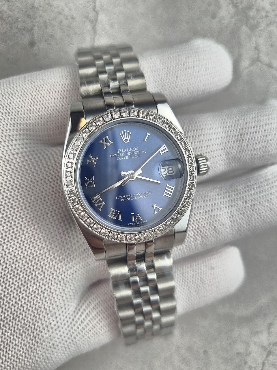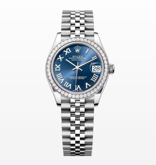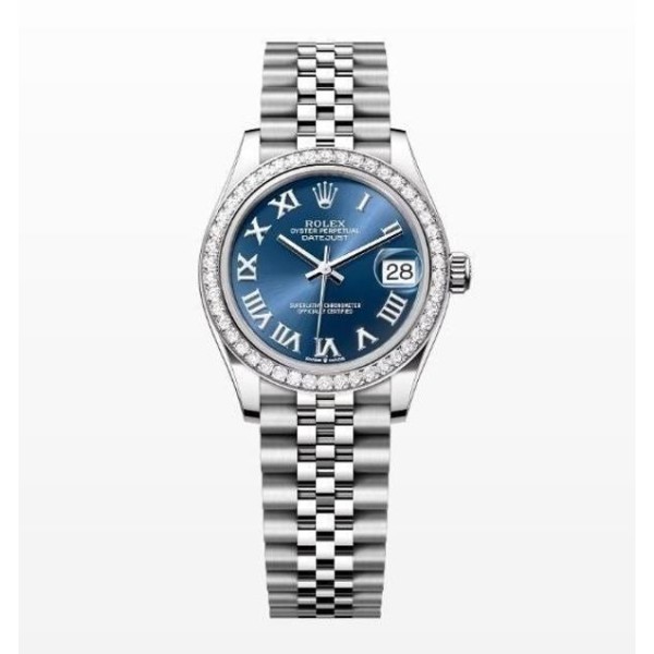 여성용 버전으로 산뜻한 블루로마다이얼과 다이얼안의 다이아셋팅이 특별함이 더해진 시계입니다. 워치메이커의 육안으로 이루어지는 꼼꼼한 마감 관리를 통해 완벽한 아름다움을 보장합니다. 쥬빌리(Jubilee) 브레슬릿은 유연하고 착용감이 뛰어난 5열 링크 메탈 브레슬릿으로, 1945년 출시된 오이스터 퍼페츄얼 데이트저스트를 위해 특별히 제작되었습니다.
