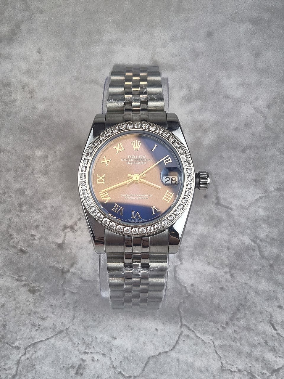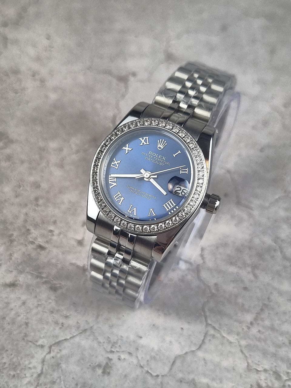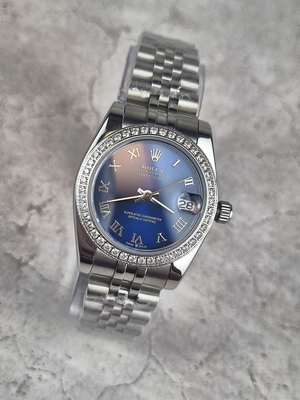 여성용 버전으로 산뜻한 블루로마다이얼과 다이얼안의 다이아셋팅이 특별함이 더해진 시계입니다. 워치메이커의 육안으로 이루어지는 꼼꼼한 마감 관리를 통해 완벽한 아름다움을 보장합니다. 쥬빌리(Jubilee) 브레슬릿은 유연하고 착용감이 뛰어난 5열 링크 메탈 브레슬릿으로, 1945년 출시된 오이스터 퍼페츄얼 데이트저스트를 위해 특별히 제작되었습니다.