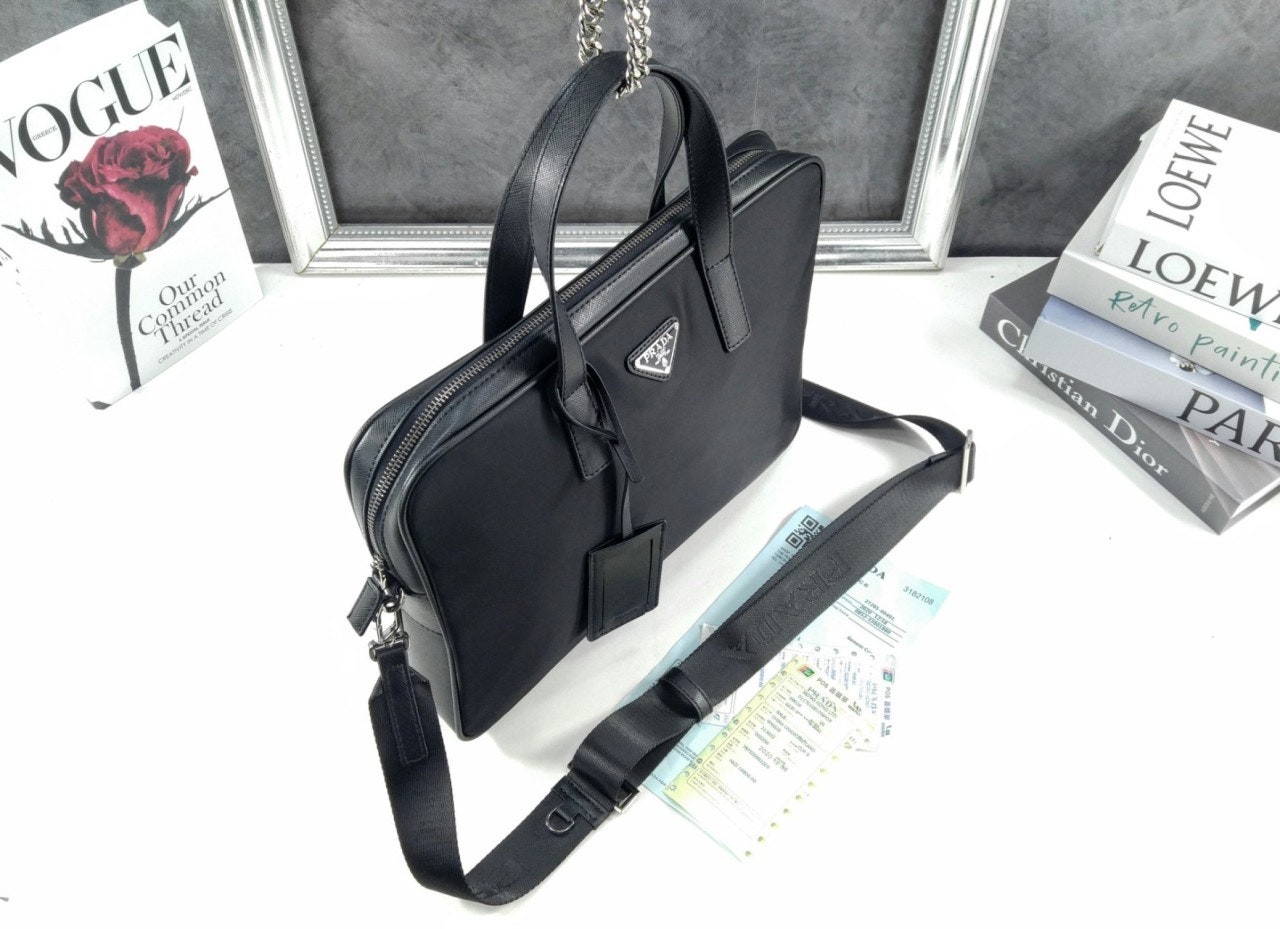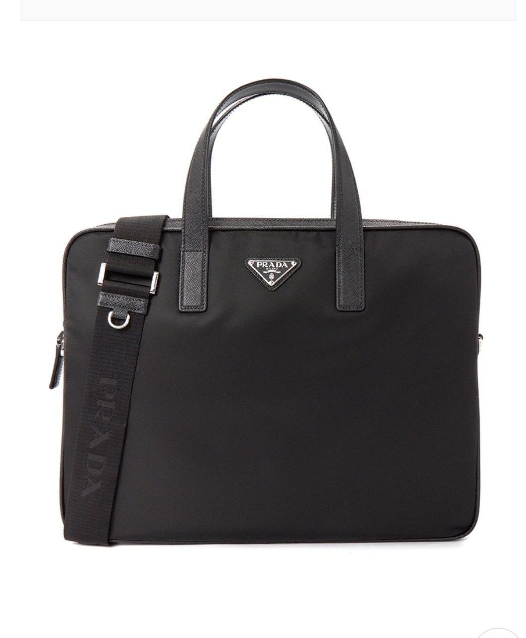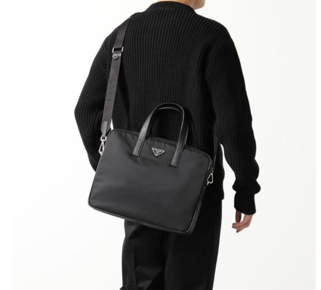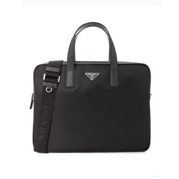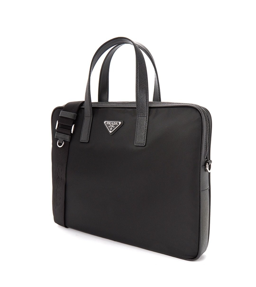 프**의 아이코닉한 소재인 리나일론과 사피아노 가죽 디테일을 혼합하여 우아하고 활용성이 좋은 디자인으로 완성한 브리프케이스입니다. 실용적인 지퍼 클로저와 탈부착형 숄더 스트랩이 특징인 넉넉한 크기의 액세서리로, 에나멜 메탈 트라이앵글 로고로 장식했습니다.