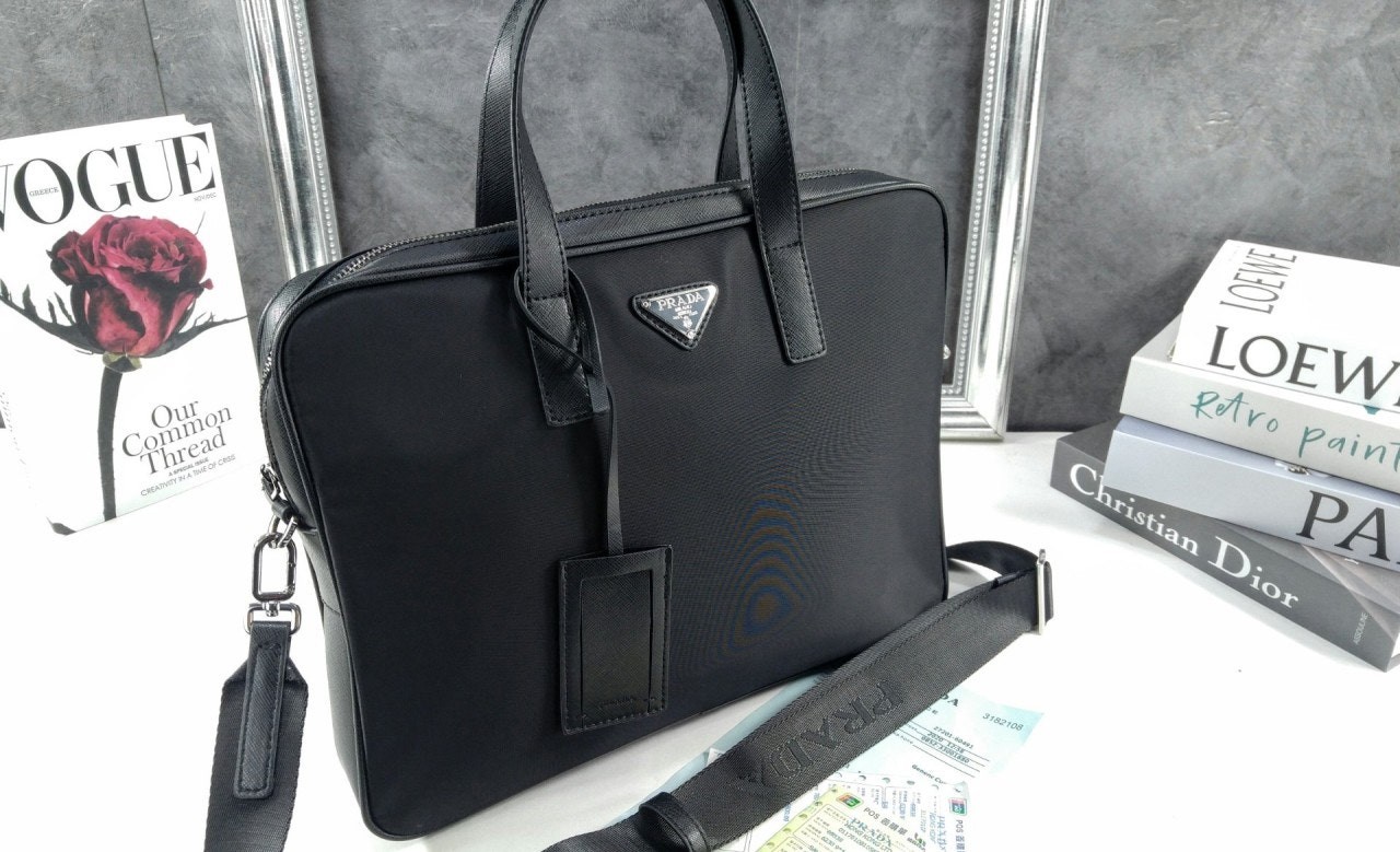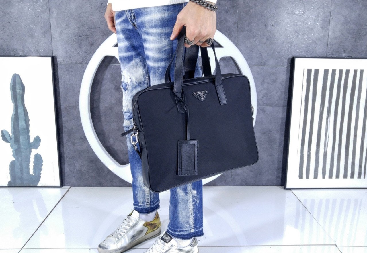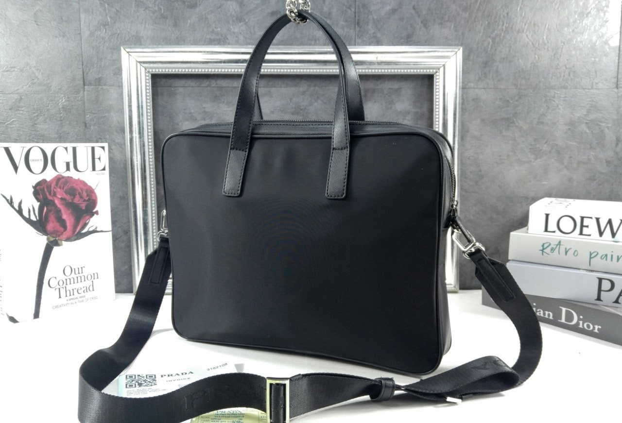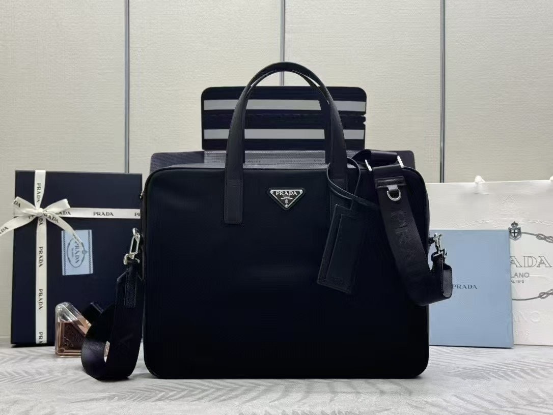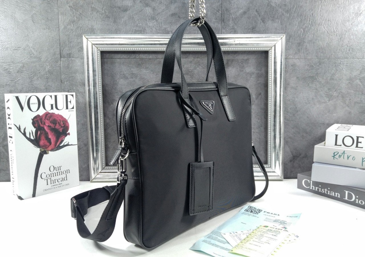프**의 아이코닉한 소재인 리나일론과 사피아노 가죽 디테일을 혼합하여 우아하고 활용성이 좋은 디자인으로 완성한 브리프케이스입니다. 실용적인 지퍼 클로저와 탈부착형 숄더 스트랩이 특징인 넉넉한 크기의 액세서리로, 에나멜 메탈 트라이앵글 로고로 장식했습니다.