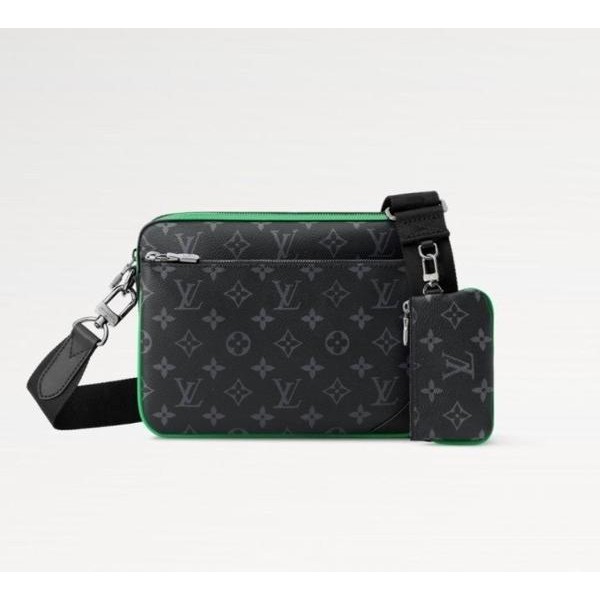 모노그램 이클립스 리버스 캔버스 소재에 터콰이즈 색상으로 포인트를 준 트리오 메신저 백. 메인 파우치, 탈착 가능한 지퍼형 앞면 포켓, 스트랩에 달린 탈착형 코인 퍼스를 포함하여 세 개의 백으로 구성된 아이템. 루* 시그니처가 새겨진 탈착 및 조절 가능한 텍스타일 스트랩을 활용하여 편안한 숄더 백으로 연출할 수 있는 스타일.