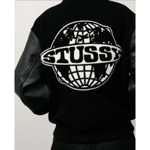 •Stus** FW25 GLOBE VARSITY 재킷은 로고 자수와 벨벳 셰니유 패턴, 가죽 디테일이 조화를 이룬 레더 바시티 재킷으로 이번 시즌 가장 소장 가치가 높은 아이템입니다. 활용도 높은 블랙 컬러로 제작되었으며, 디자인과 마감에서 Stus**의 클래식을 충실히 재현해 별도의 설명이 필요 없을 만큼 대표적인 작품이라 할 수 있습니다. 전체 실루엣은 남녀 공용 디자인의 여유 있는 설계로, 레글런이 아닌 전형적인 바시티 패턴을 따르며 착용했을 때 퀄리티 있는 무게감과 존재감이 느껴집니다.