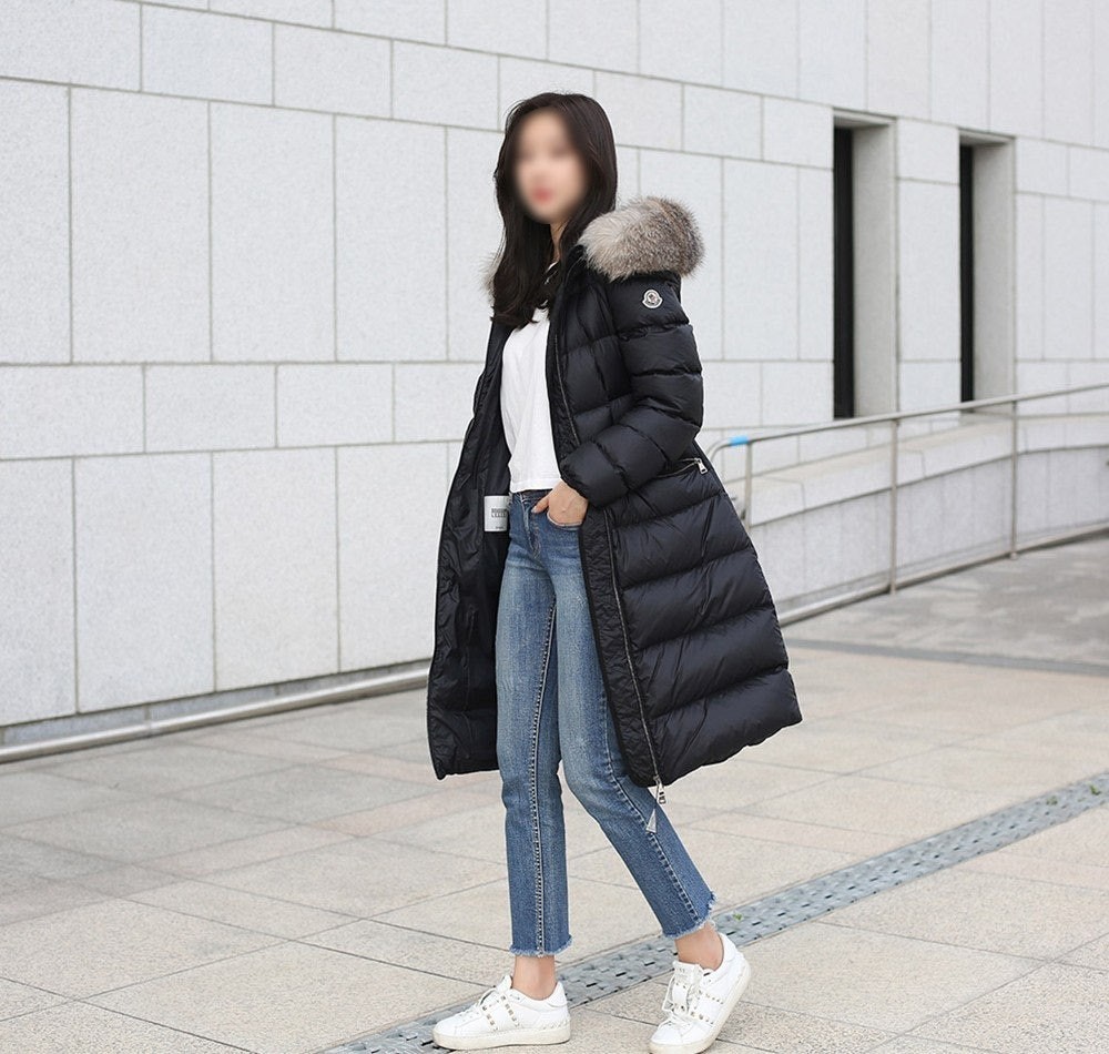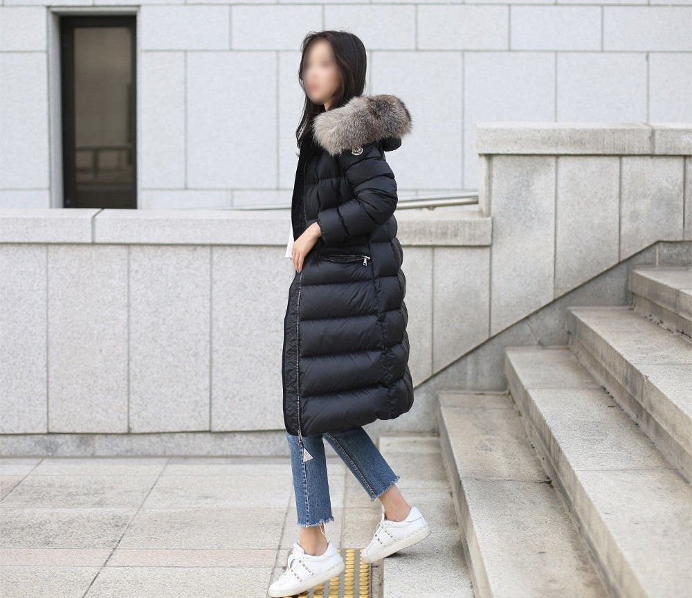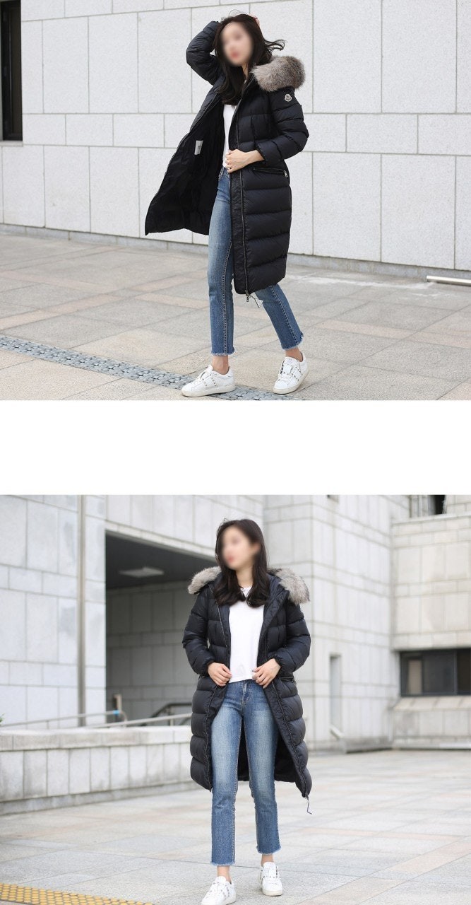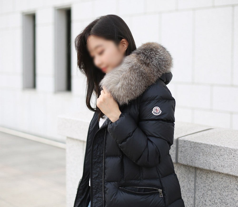 다운 코트의 포근한 후드에는 고급스러운 롱 헤어 쉽스킨