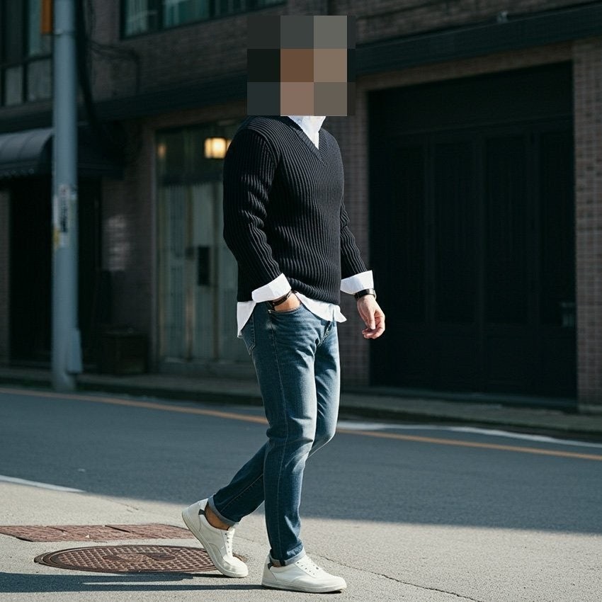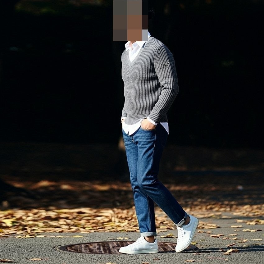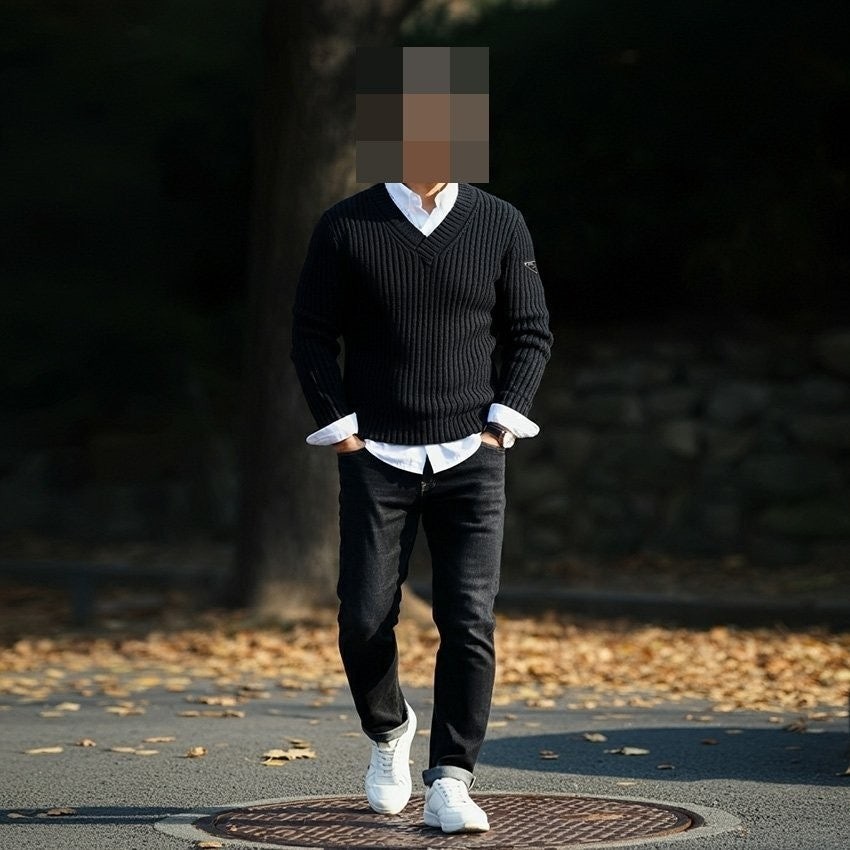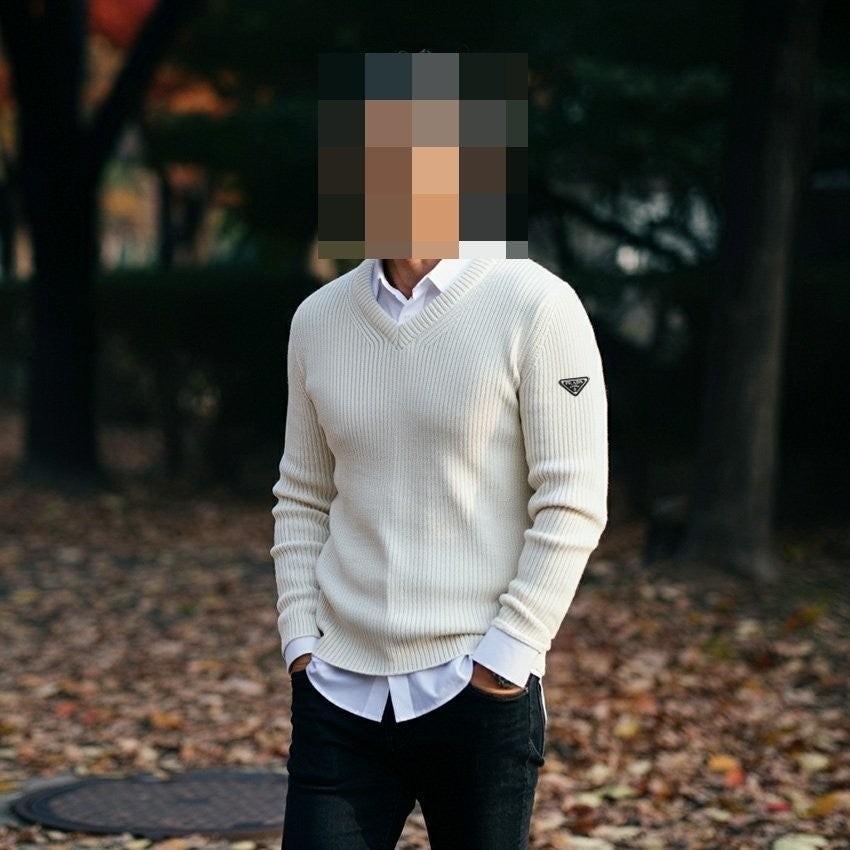 프** 솔리드 골지 브이넥 니트