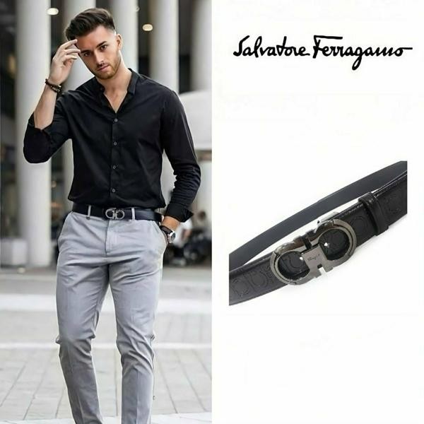 ☑️페*** 로고가 블랙 버클 중간에 페*** 로고가 포인트로 들어가 있으며 브랙 스트랩으로 무난하게 착용할 수 있는 페라가모 벨트입니다☆☆☆