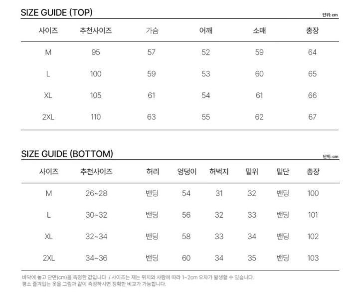 하의: M(30)/ L(32)/ XL(34)/ 2XL(36)