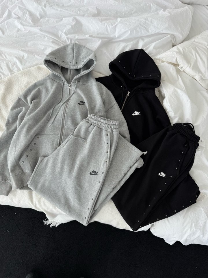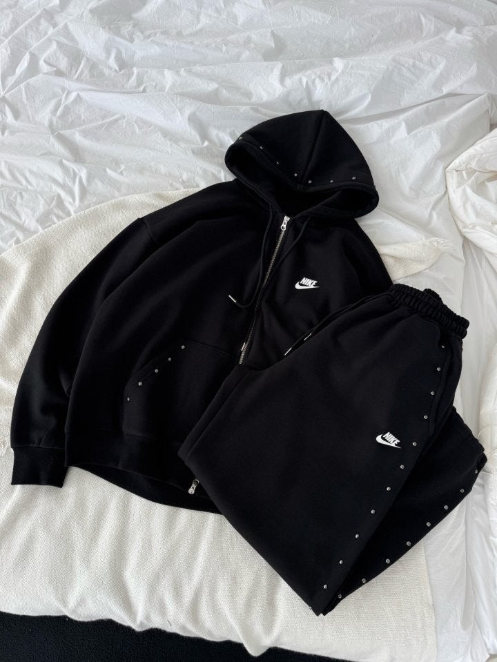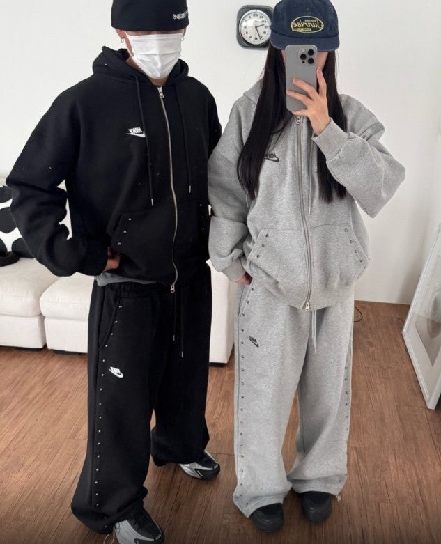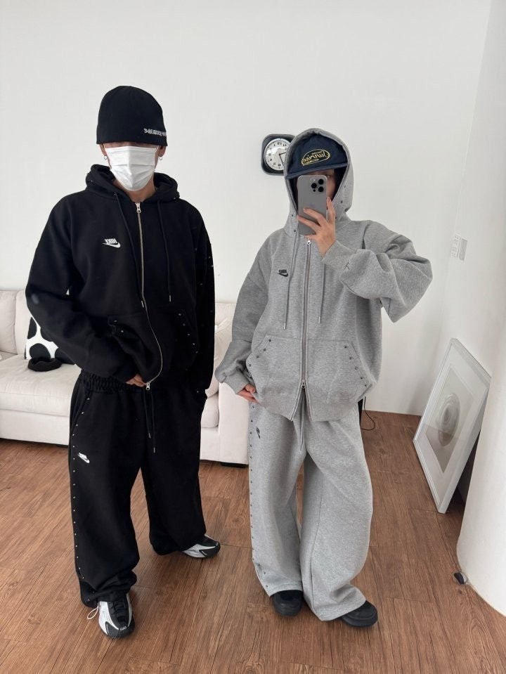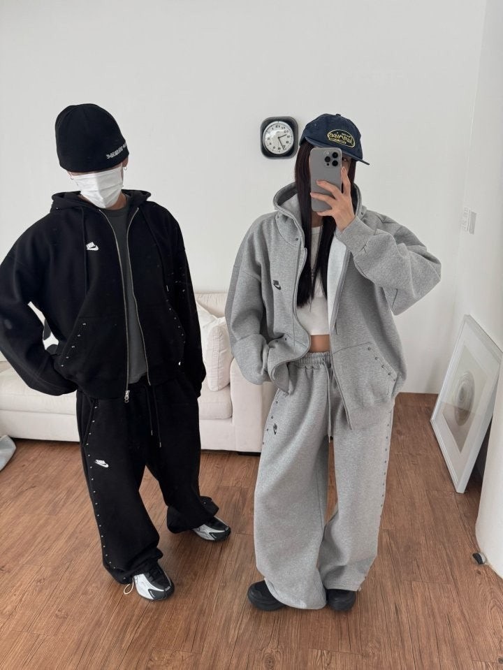 상하의 스터드 포인트로 손이 자주 갈 제품이며 후드팬츠 오버핏 체형으로 커버 가능하며 흐르는 듯한 오버핏으로 부해보이지않은 제품입니다.