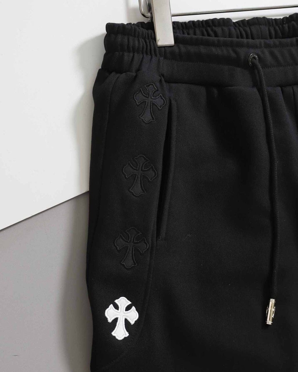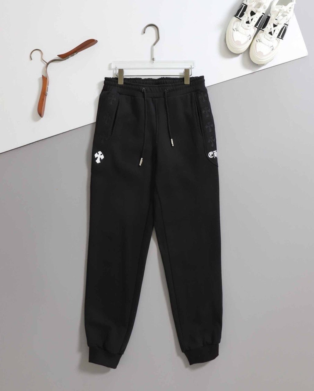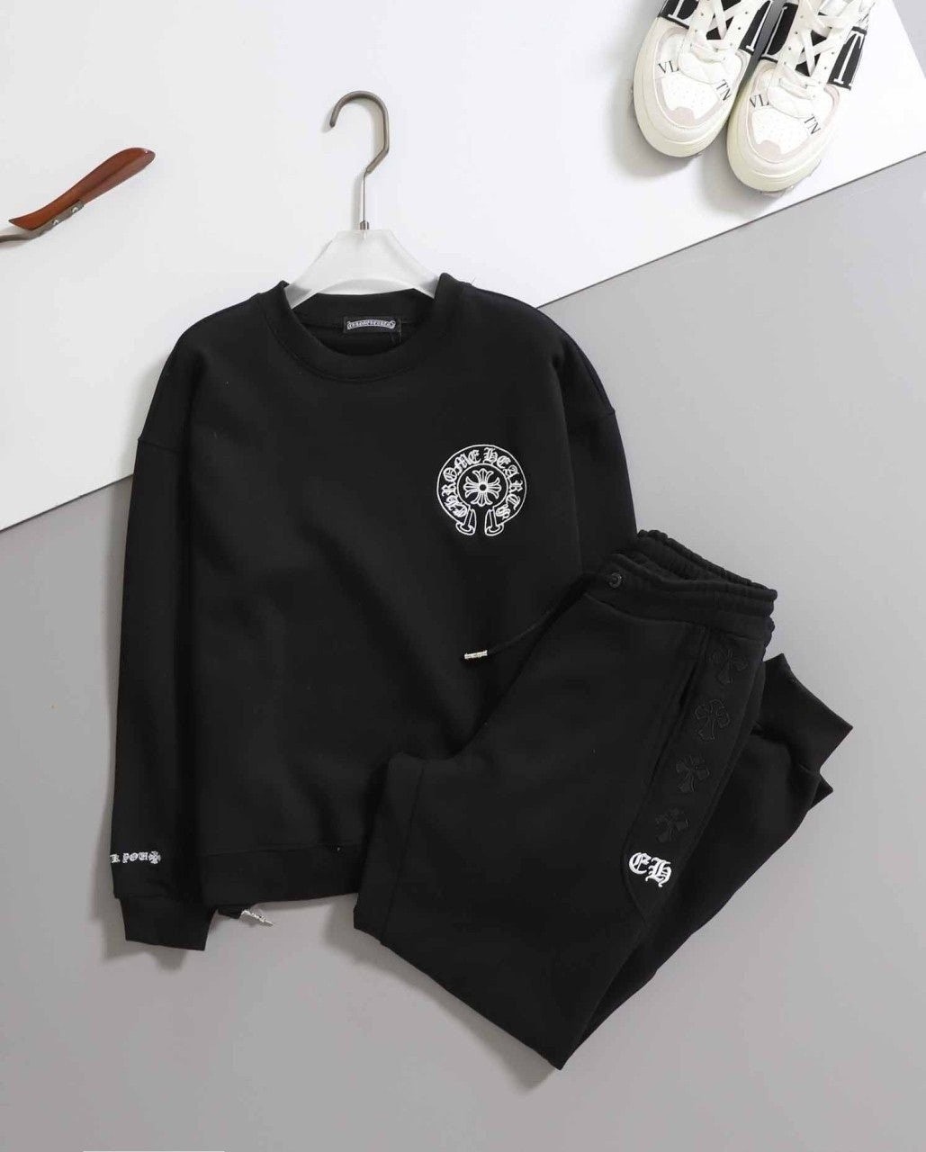- 상의 전면 가슴과 하의 옆면에는 브랜드의 상징적인 크로스 로고가 특징입니다.