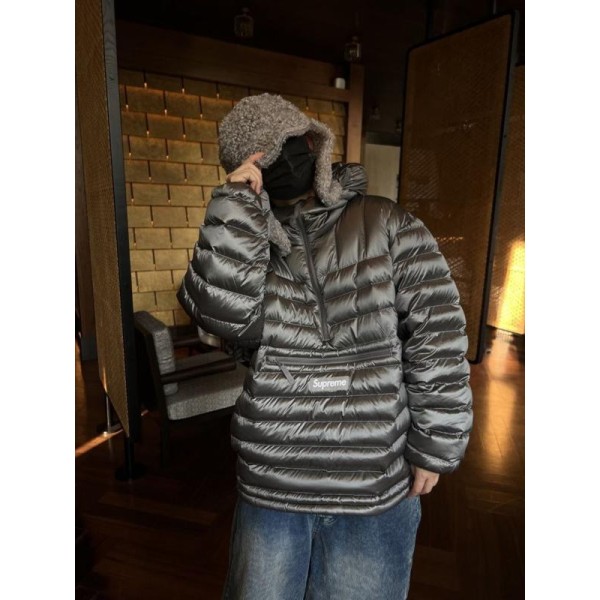 •Supre** FW WEEK6 마이크로 다운 하프 지퍼 후드 풀오버(짜임 로고 라벨 장착) 반지퍼 형태의 립(퀼팅) 다운 재킷, 남녀 공용입니다. 충전재는 90% 화이트 덕다운을 사용했고, 모든 디테일은 원본과 1:1로 재현되었습니다. 원단·지퍼·색상 등 부자재는 맞춤 제작되어 매장 진열용 오리지널과 구분 없이 착용하실 수 있는 수준입니다. 색상은 블랙·핑크·그레이이며 전체적으로 넉넉한 루즈핏입니다.