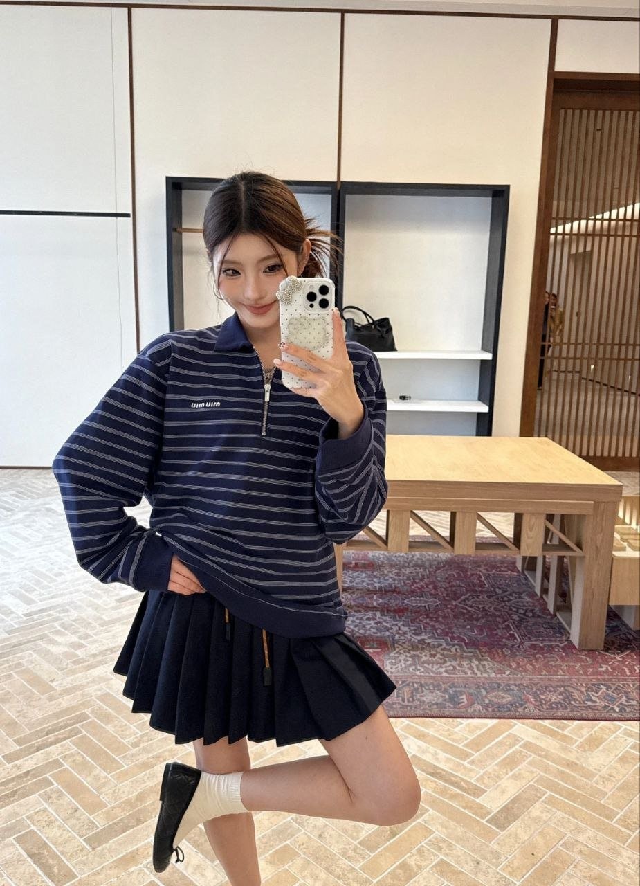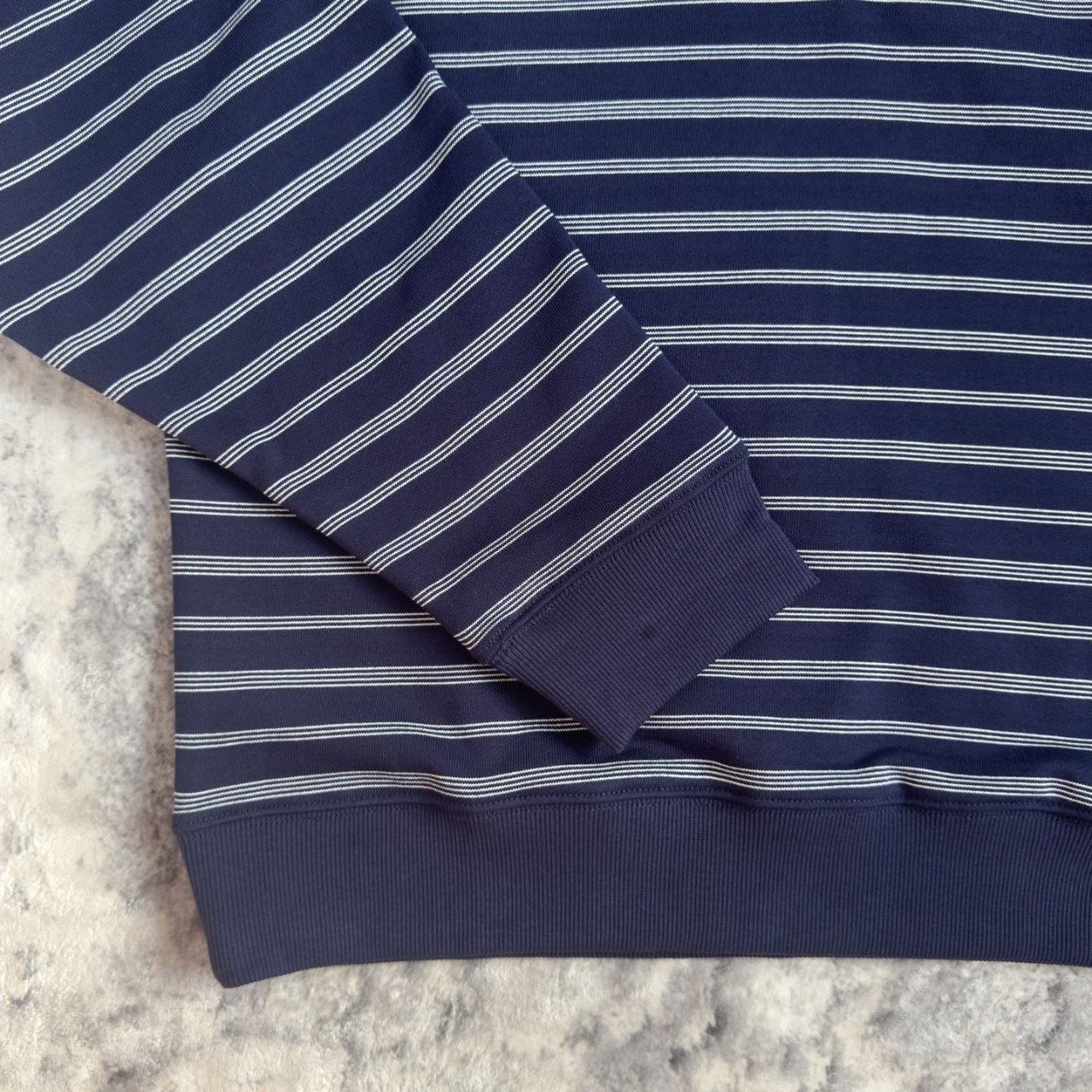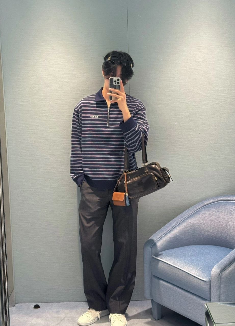 •원단은 자유 대원형 자카드 편직기로 별도 주문 편직했으며, 24수+7수 정교면(콤드 코튼) 혼용의 루프백 스웻 원단(면 95% + 스판 5%), 중량 380g을 사용했습니다. 매치되는 2×2 원통 립도 380g으로 균형 있게 적용했습니다. 자수는 수입 자수기(BAILINGDA)로 진행했으며, 전용 이니셜 지퍼를 사용했습니다. 모든 제품은 순수 수작업으로 재단하고, 각 한 벌마다 스트라이프 패턴을 맞춰 위치 재단을 진행해 원단 소모가 상당히 큽니다. 특정 세 가지 태그(세탁 라벨 포함)가 있습니다.