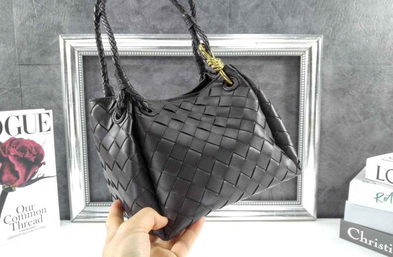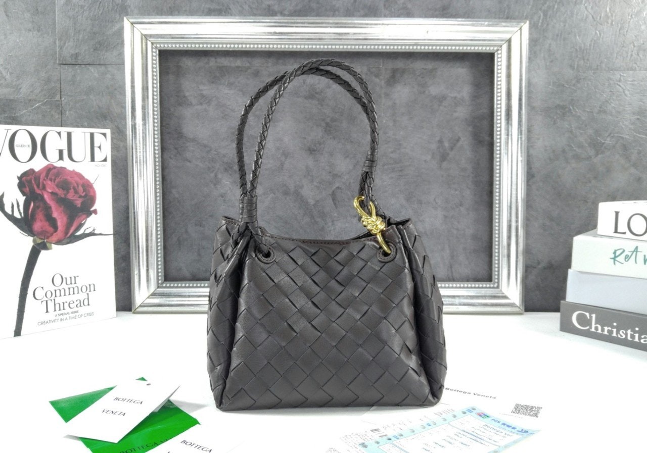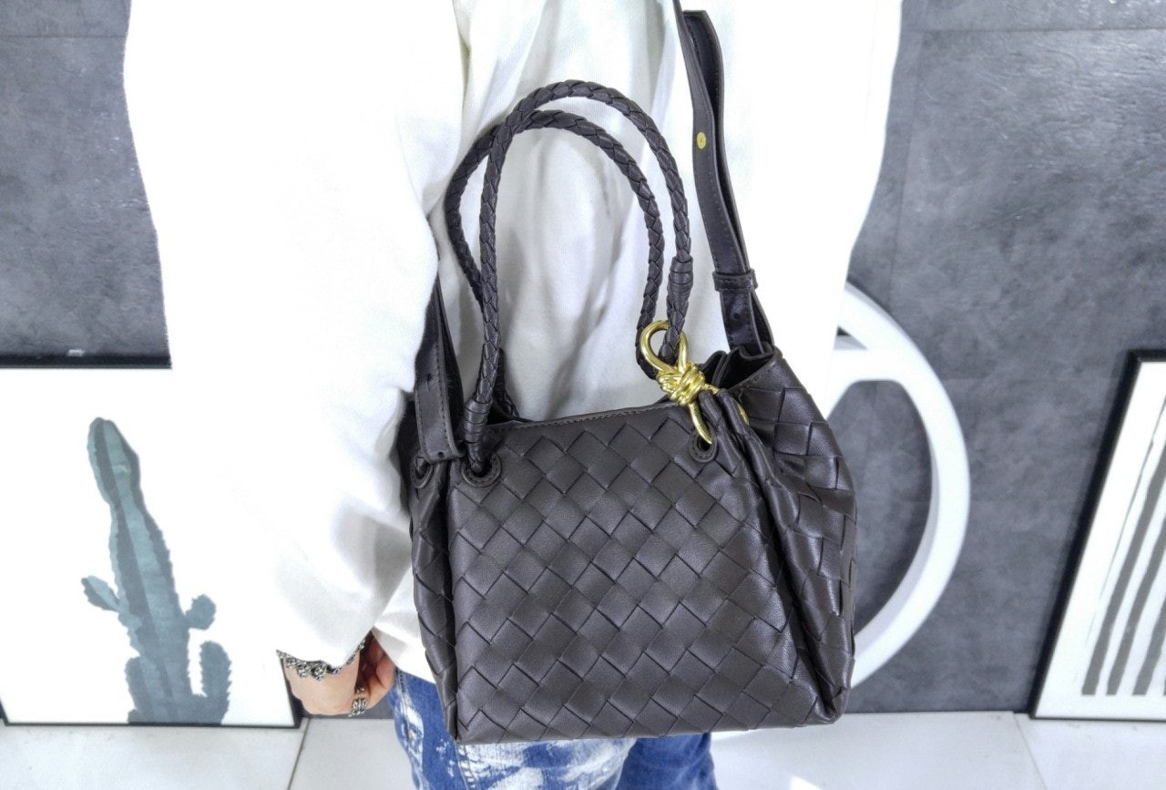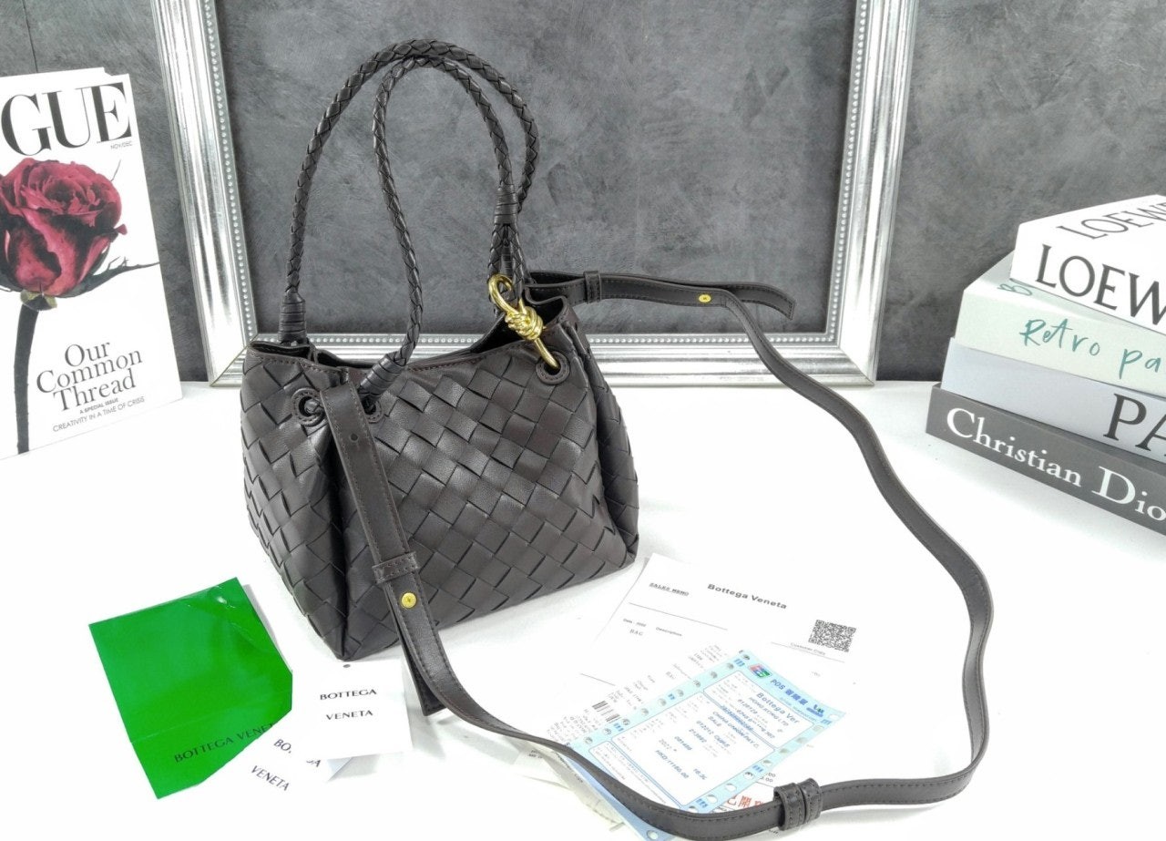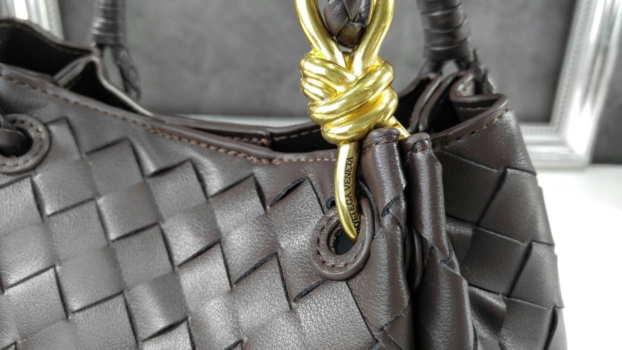 시그니처 놋 디테일과 탈착 가능한 크로스 스트랩을 갖춘 유연한 인트레치아토 가죽 소재의 숄더 백.