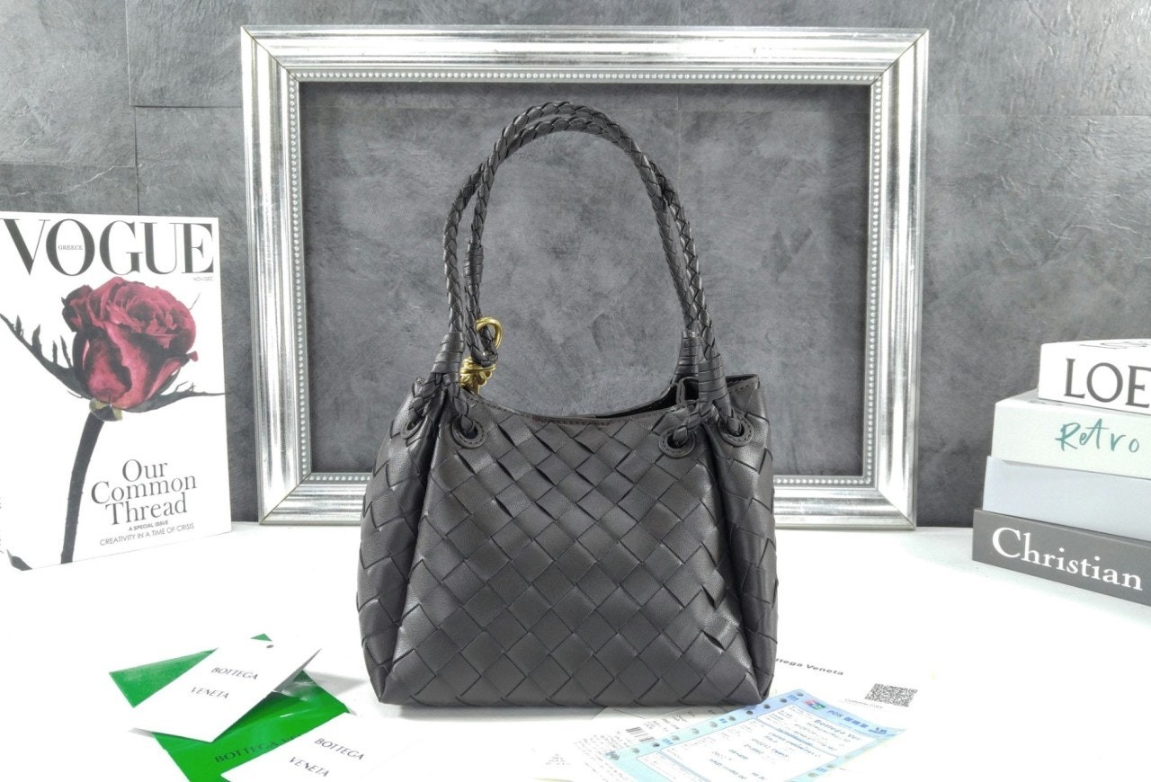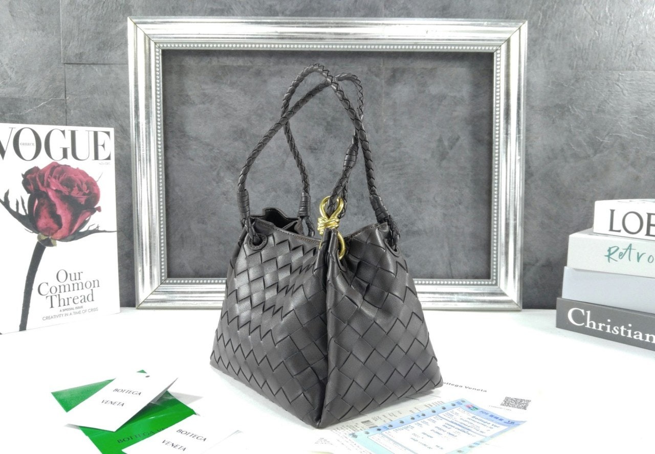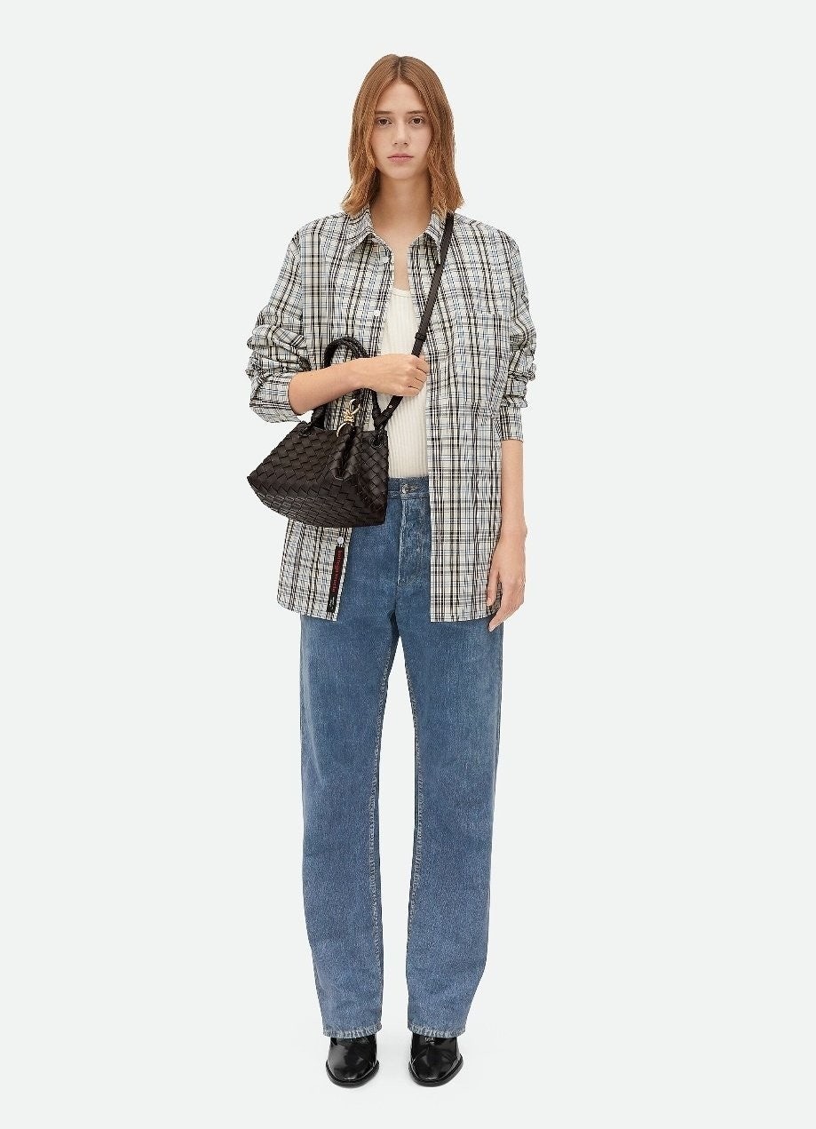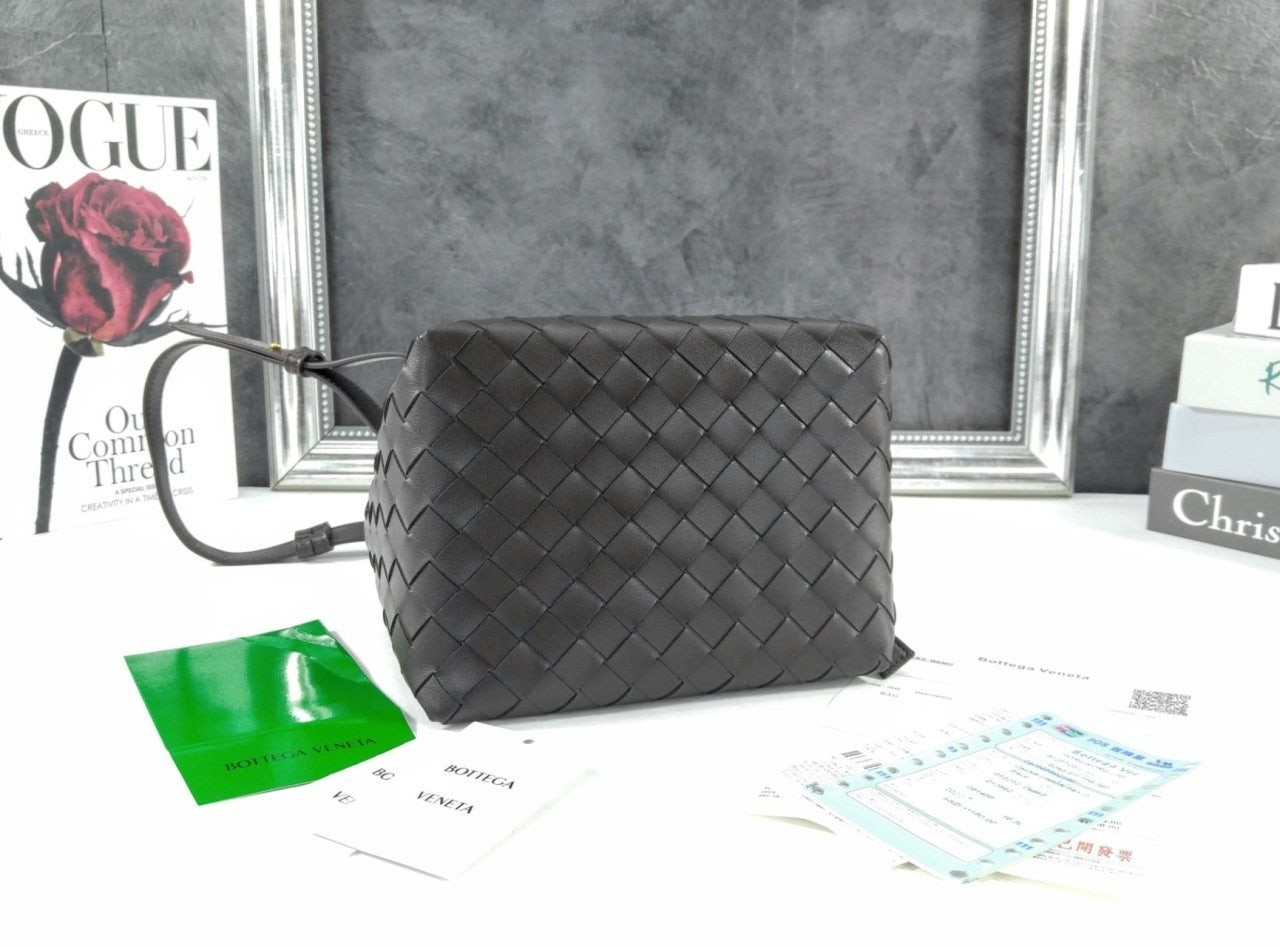시그니처 놋 디테일과 탈착 가능한 크로스 스트랩을 갖춘 유연한 인트레치아토 가죽 소재의 숄더 백.