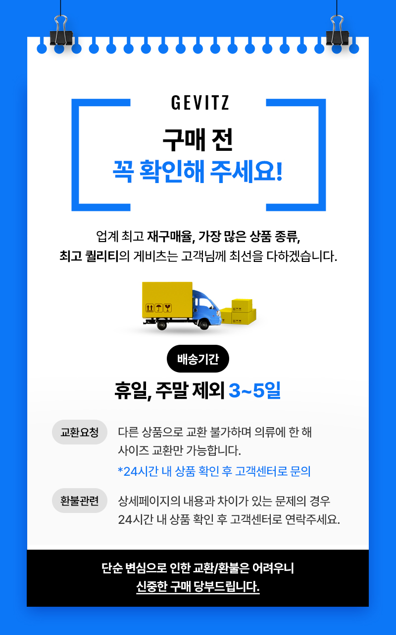 1. 교환은 구매하신 상품 동일색상으로 사이즈교환만 가능합니다. [다른 상품으로 교환X]